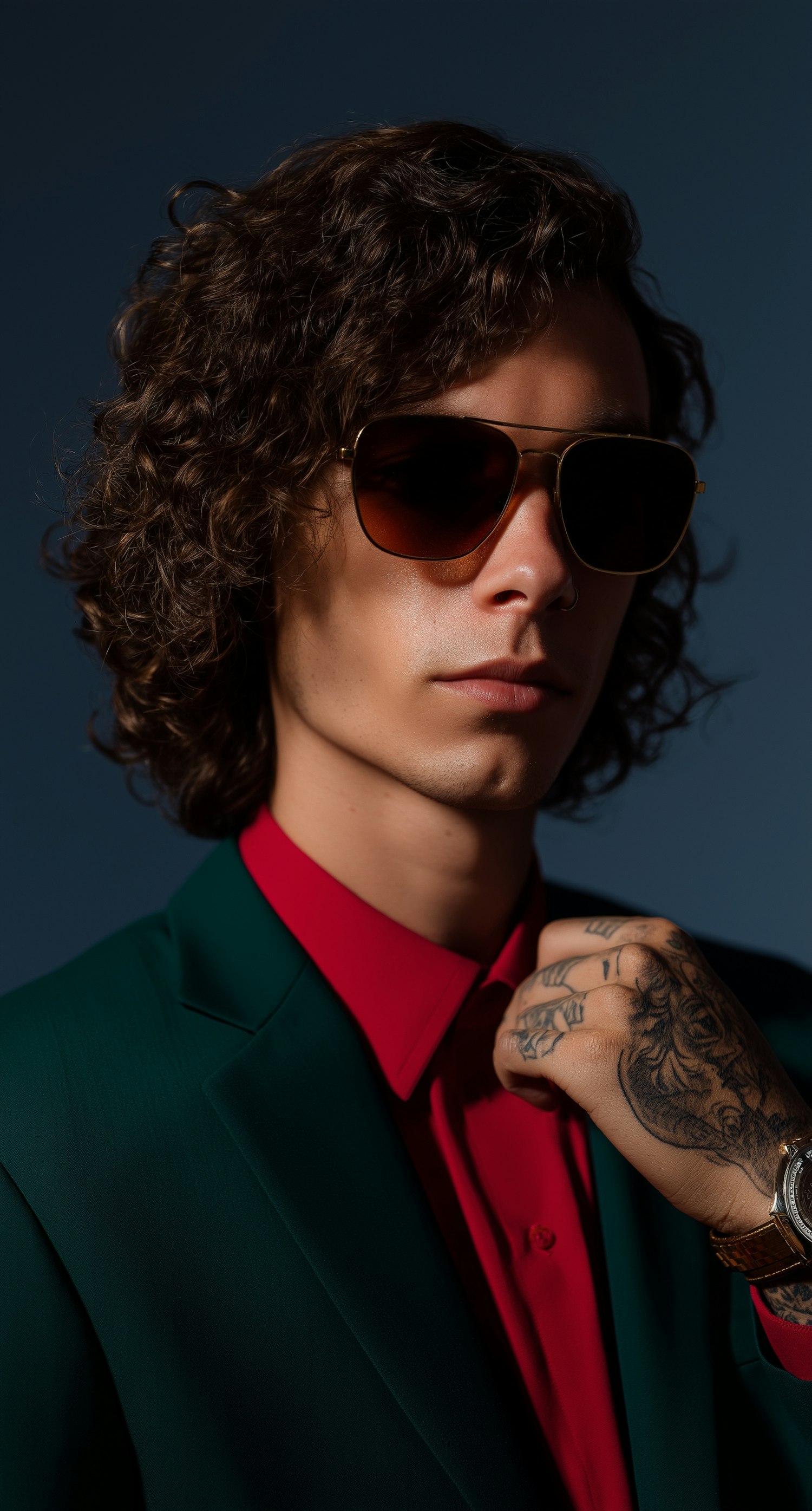 Stylish individual in a green suit and red shirt, wearing aviator sunglasses, with a tattooed hand and wristwatch, set against a dark blue backdrop.
