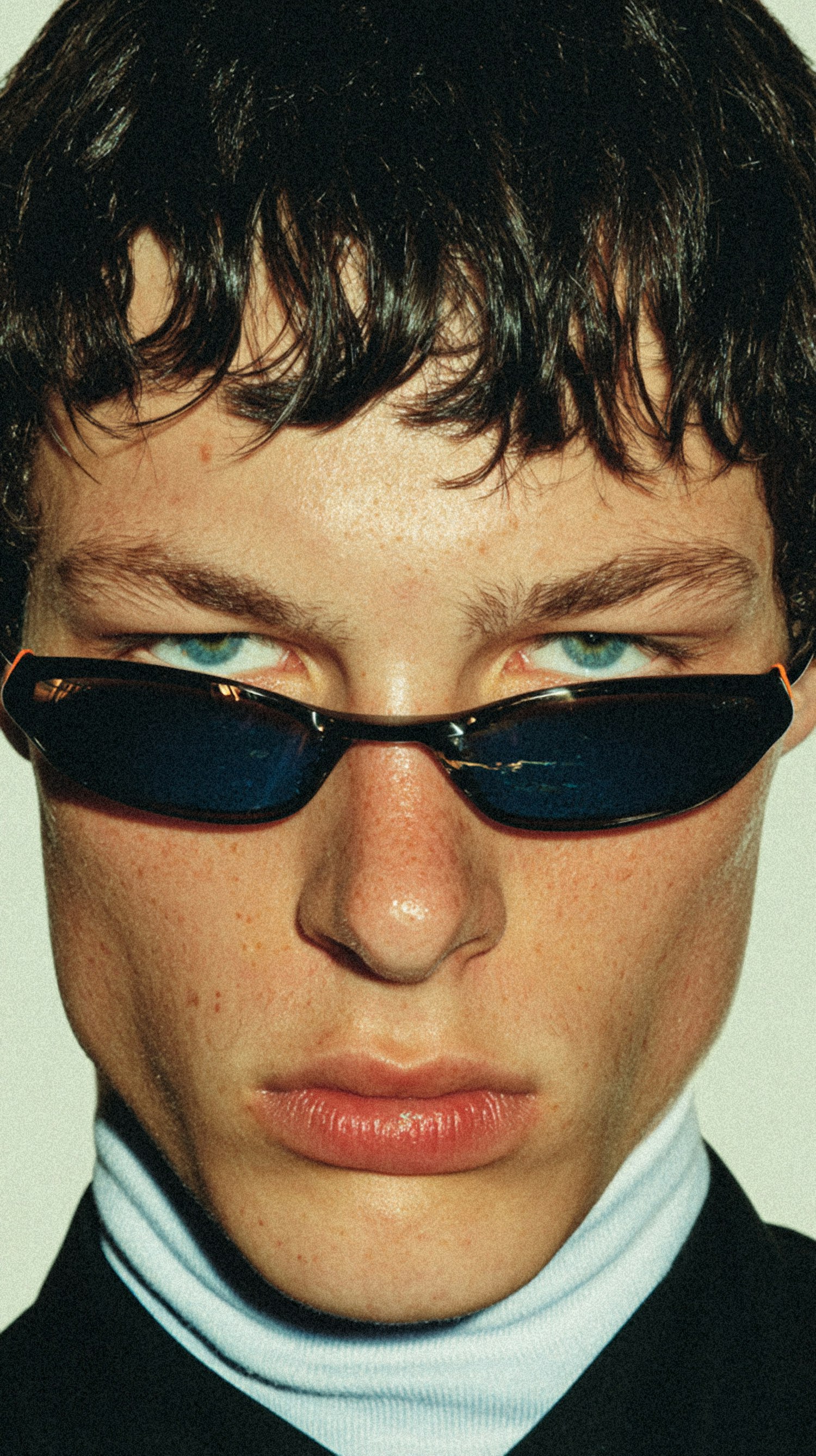 Close-up of a person with dark sunglasses and a high-collared shirt, showcasing a focused expression and detailed textures.