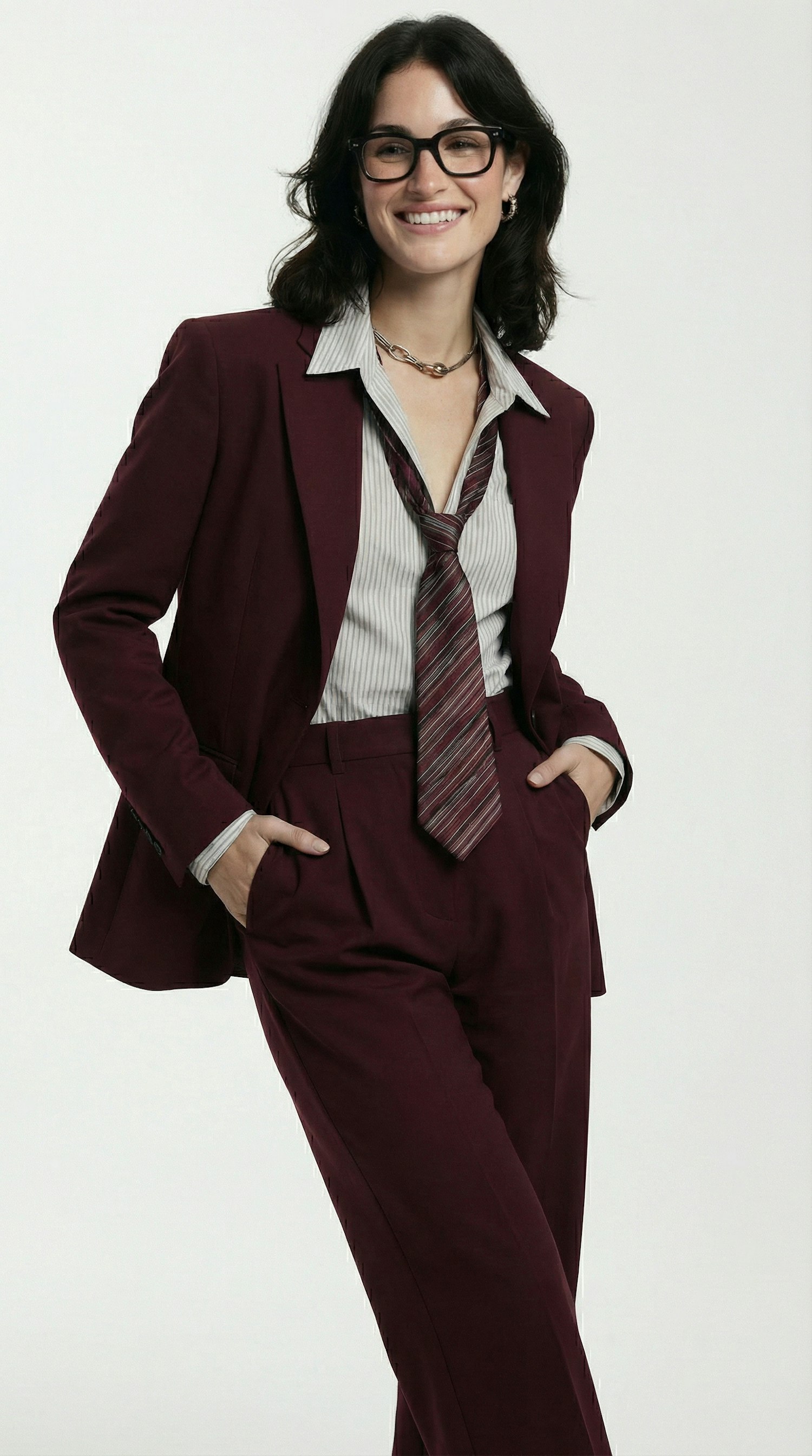 A person in a maroon suit and tie poses confidently with a cheerful expression, set against a plain white background.