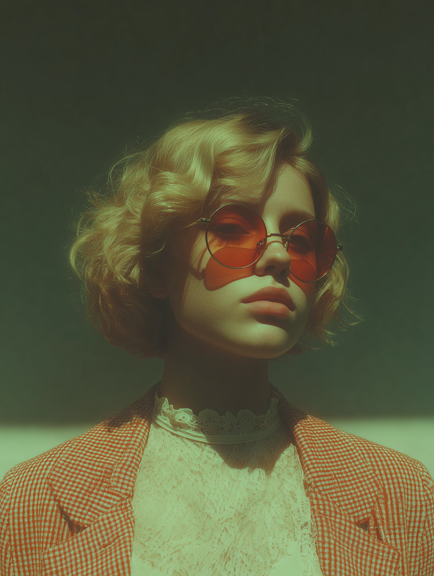 Stylish individual in orange-tinted sunglasses and a red checkered blazer, set against a moody green background with dramatic lighting.