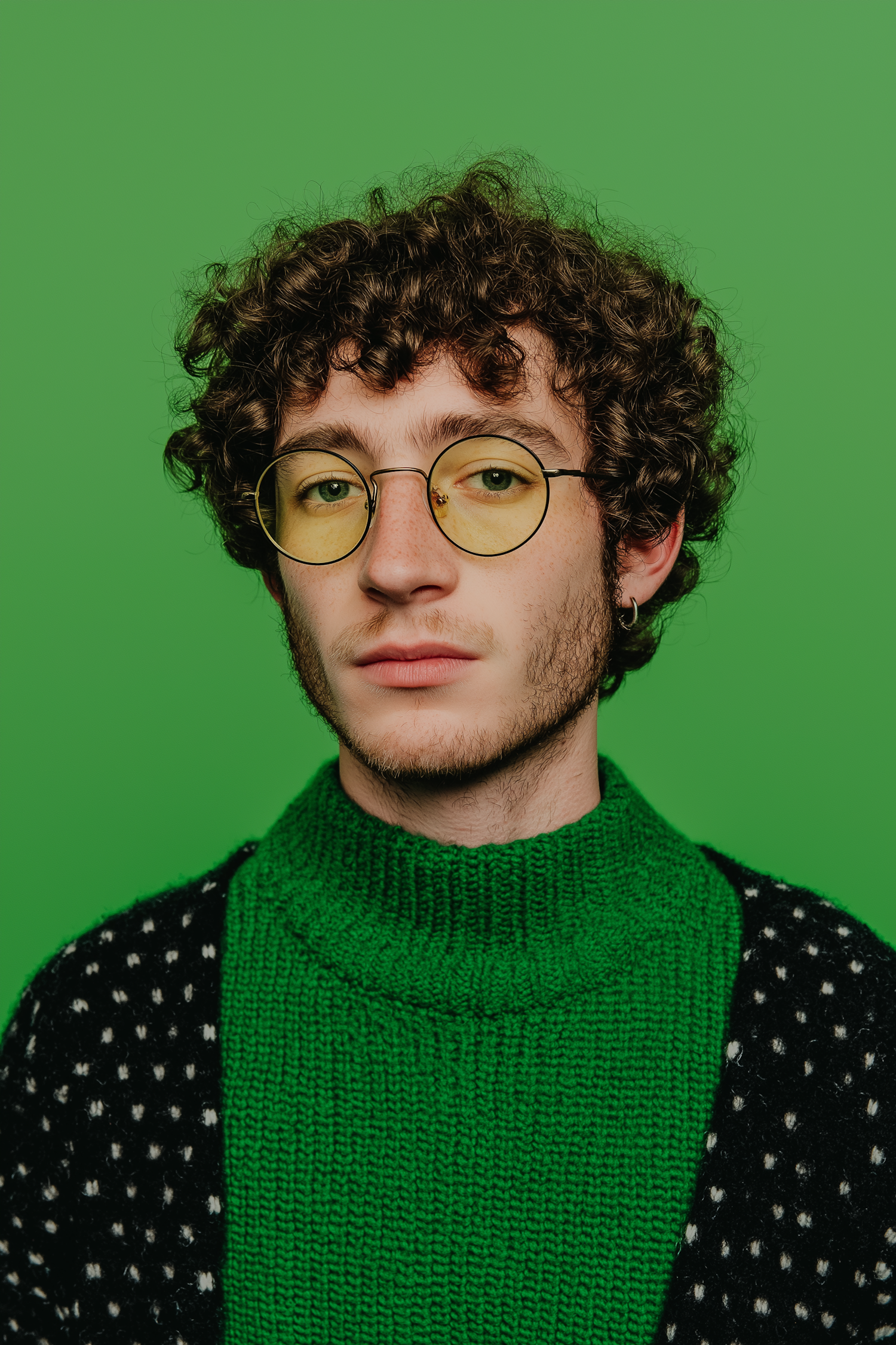 Portrait of a person with curly hair, yellow-tinted glasses, and a green sweater, set against a vibrant green background.