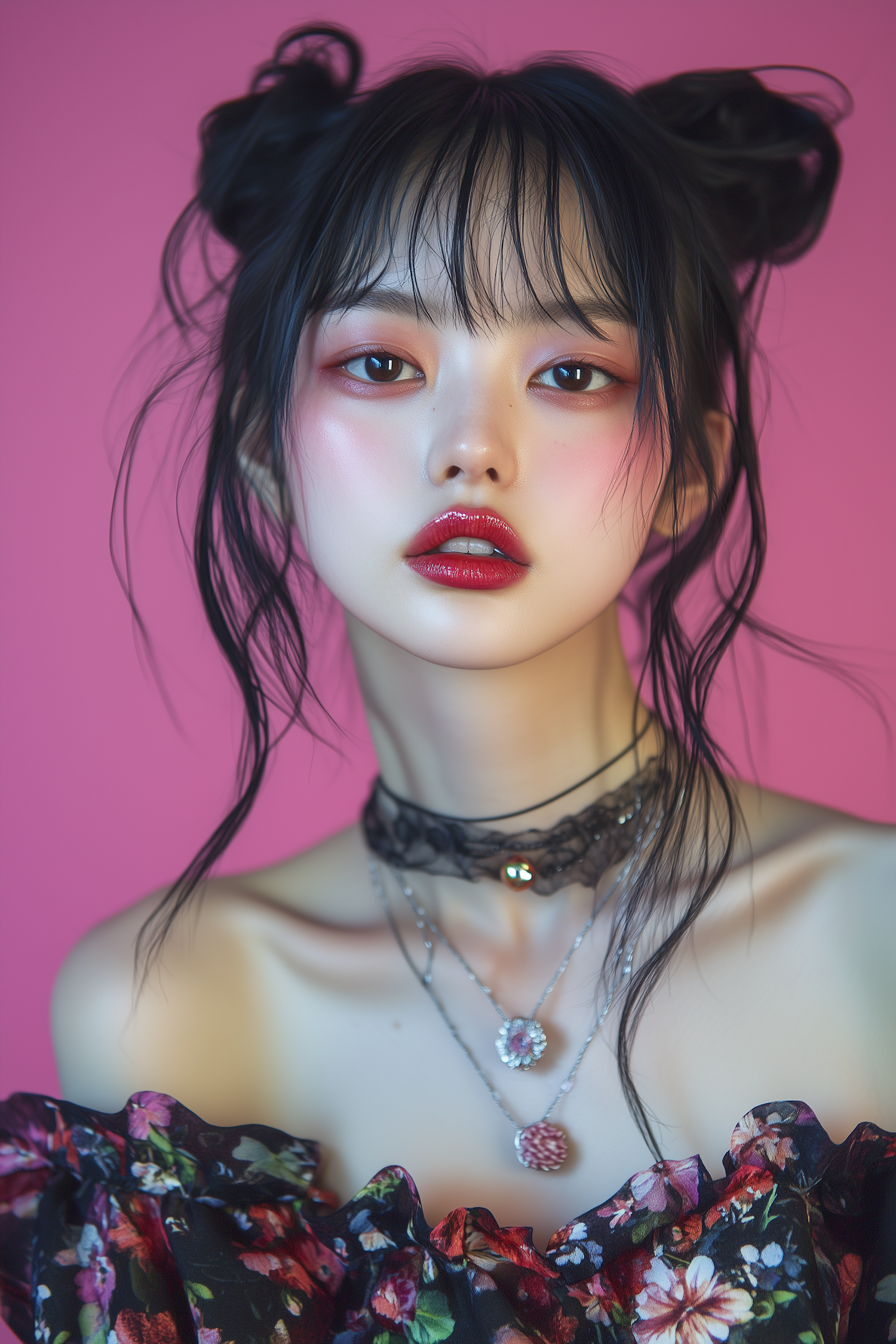 Stylish portrait of a young woman with bold makeup, floral dress, and layered jewelry against a vibrant pink background.