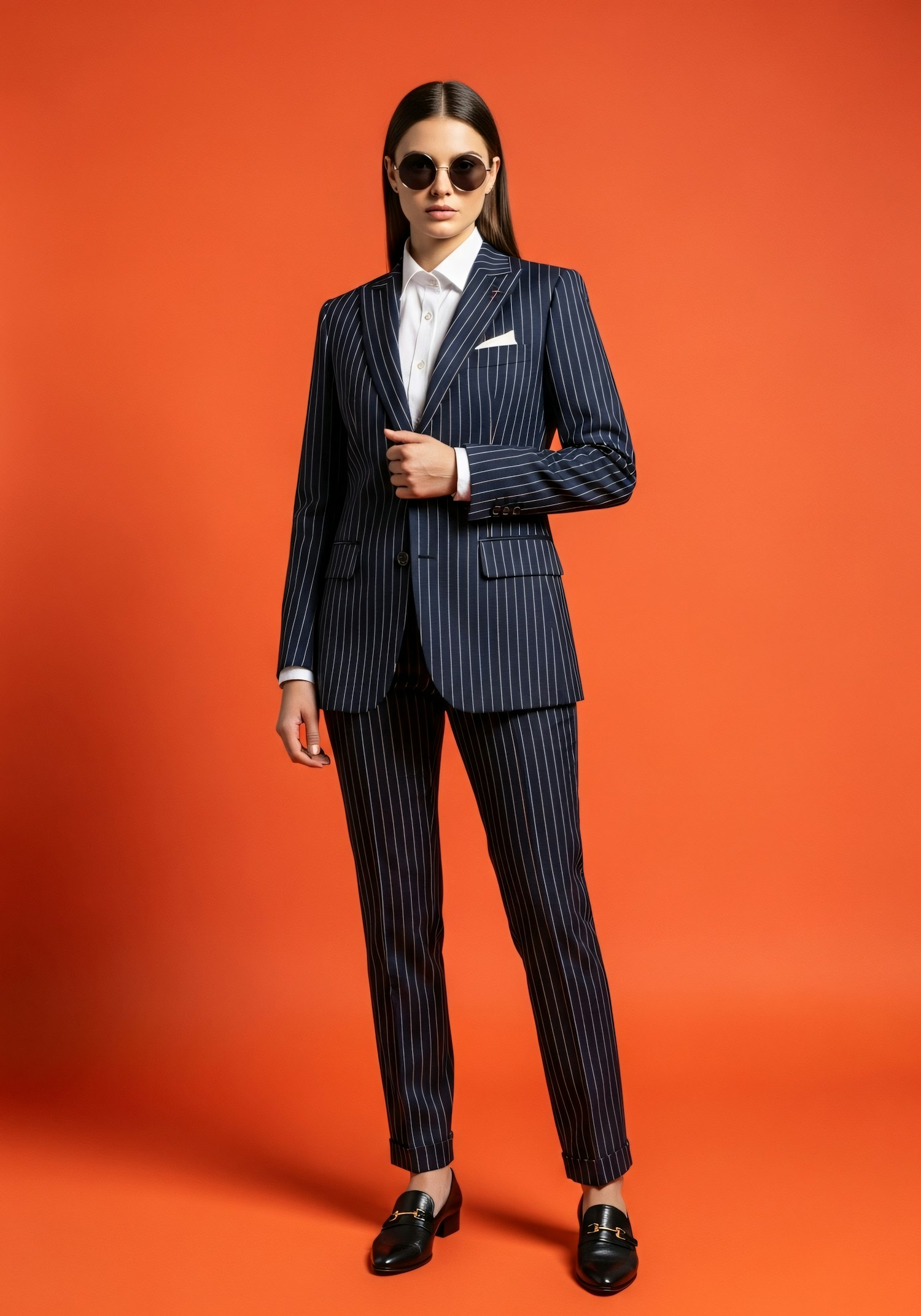 Stylish individual in a navy pinstripe suit and sunglasses, standing confidently against a bold orange background.