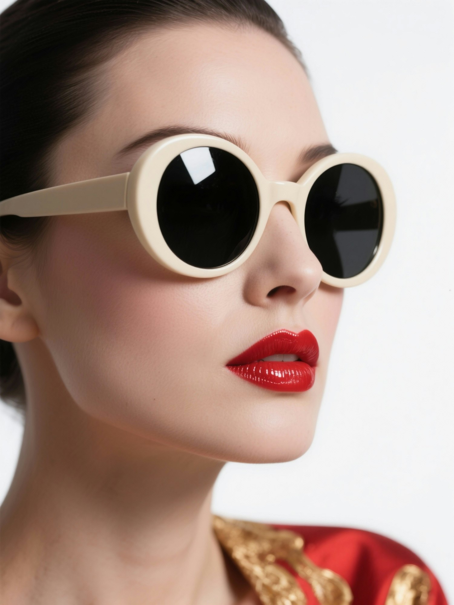 Close-up of a person with bold red lipstick, cream sunglasses, and a red outfit with gold details, set against a white background.
