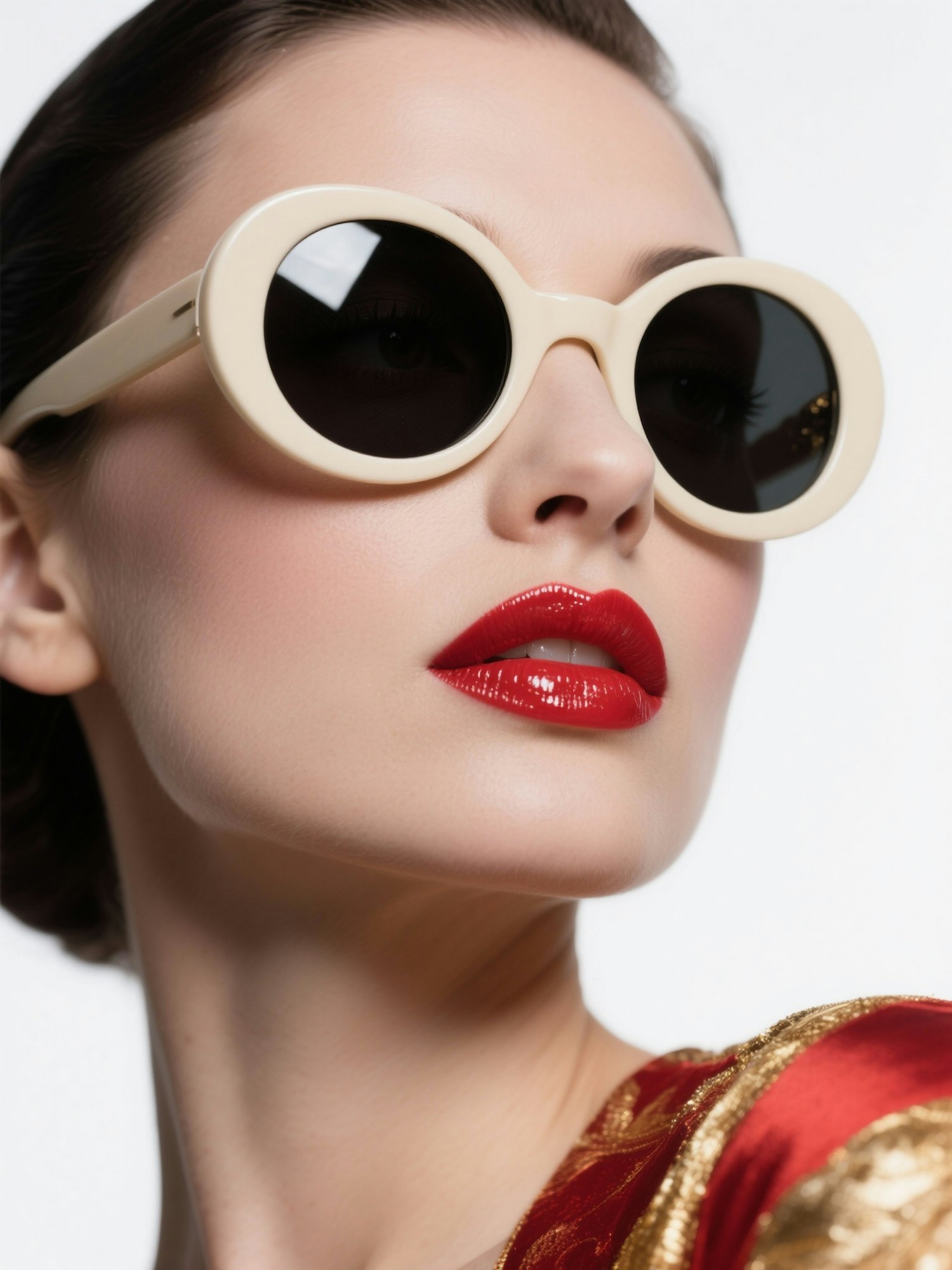 A hyperrealistic interior design photograph of a modern, minimalist living room flooded with natural light. The space features neutral beige walls, a sleek black curved sofa with dark cushions, and a round marble coffee table on top of a woven natural fiber rug. Sculptural wooden chairs with clean geometric lines are arranged around the table. On the left, a tall slender bronze statue adds an artistic touch, while on the right a futuristic floor lamp with arched metal structure and multiple small lights enhances the room’s atmosphere. On the wall behind the sofa, there is a large circular canvas completely blank, pure white, with no painting or texture, serving as a minimalist focal point. The composition is airy, elegant, and perfectly balanced — high-end interior design photography. Negative prompt: paintings, textures on the canvas, messy decor, clutter, low resolution, blurry, text, watermark. ultra close-up, hyperrealistic portrait of a glamorous woman in profile. She wears oversized round 1960s-style sunglasses with thick ivory frames and deep black lenses. Her lips are bold and glossy red, perfectly defined, reflecting the light with a mirror-like shine. She has flawless porcelain skin, smooth and luminous. Her outfit includes a hint of a luxurious red and gold garment, elegant and regal, but the main focus is entirely on her face and accessories. The background is pure white, minimalistic and bright, creating a striking contrast with the sunglasses and lips. Editorial, cinematic, high-fashion photography style. Negative prompt: dark background, blurry, distorted proportions, messy details, cartoonish, watermark, low resolution, modern casual glasses.