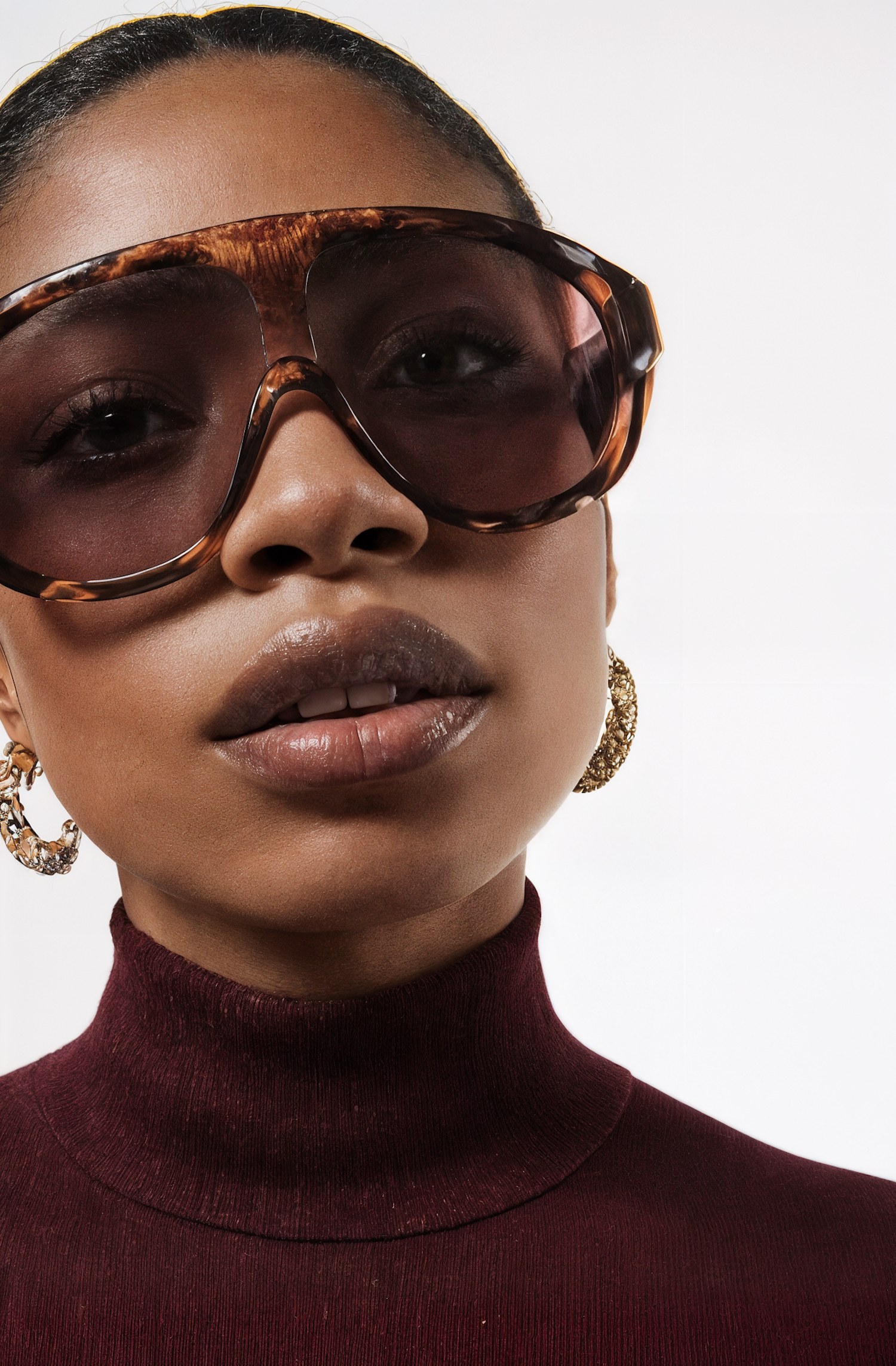 Close-up of a person wearing tortoiseshell sunglasses, gold hoop earrings, and a burgundy top against a white background.