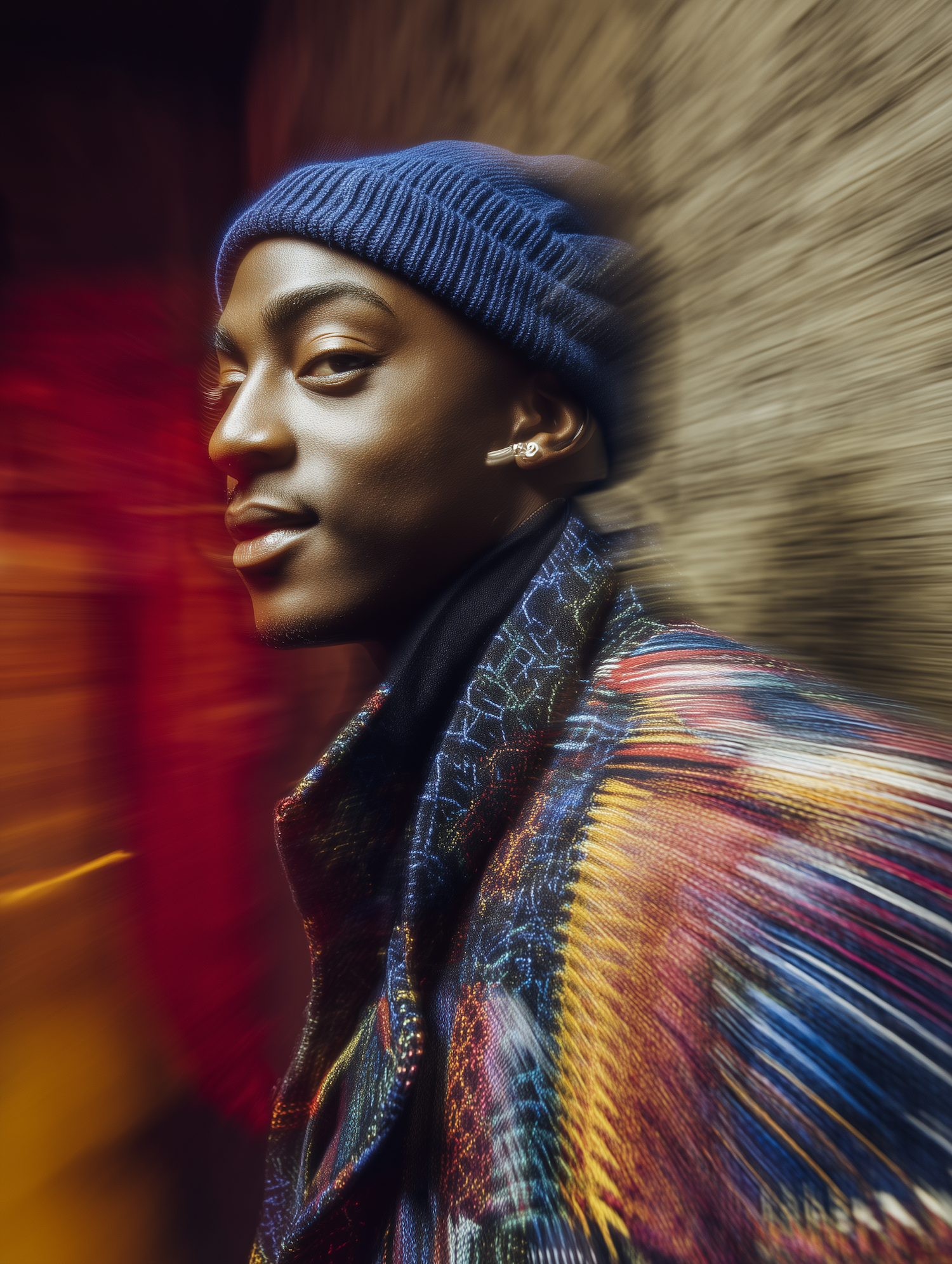 Stylish portrait of a man in a blue beanie and colorful jacket, set against a blurred, warm-toned background with dynamic motion effects.