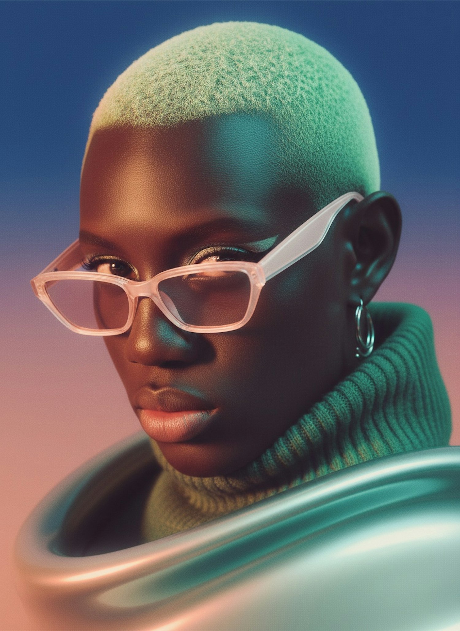 Stylish portrait of a person with green hair, translucent glasses, and a green sweater against a pink and blue gradient background.