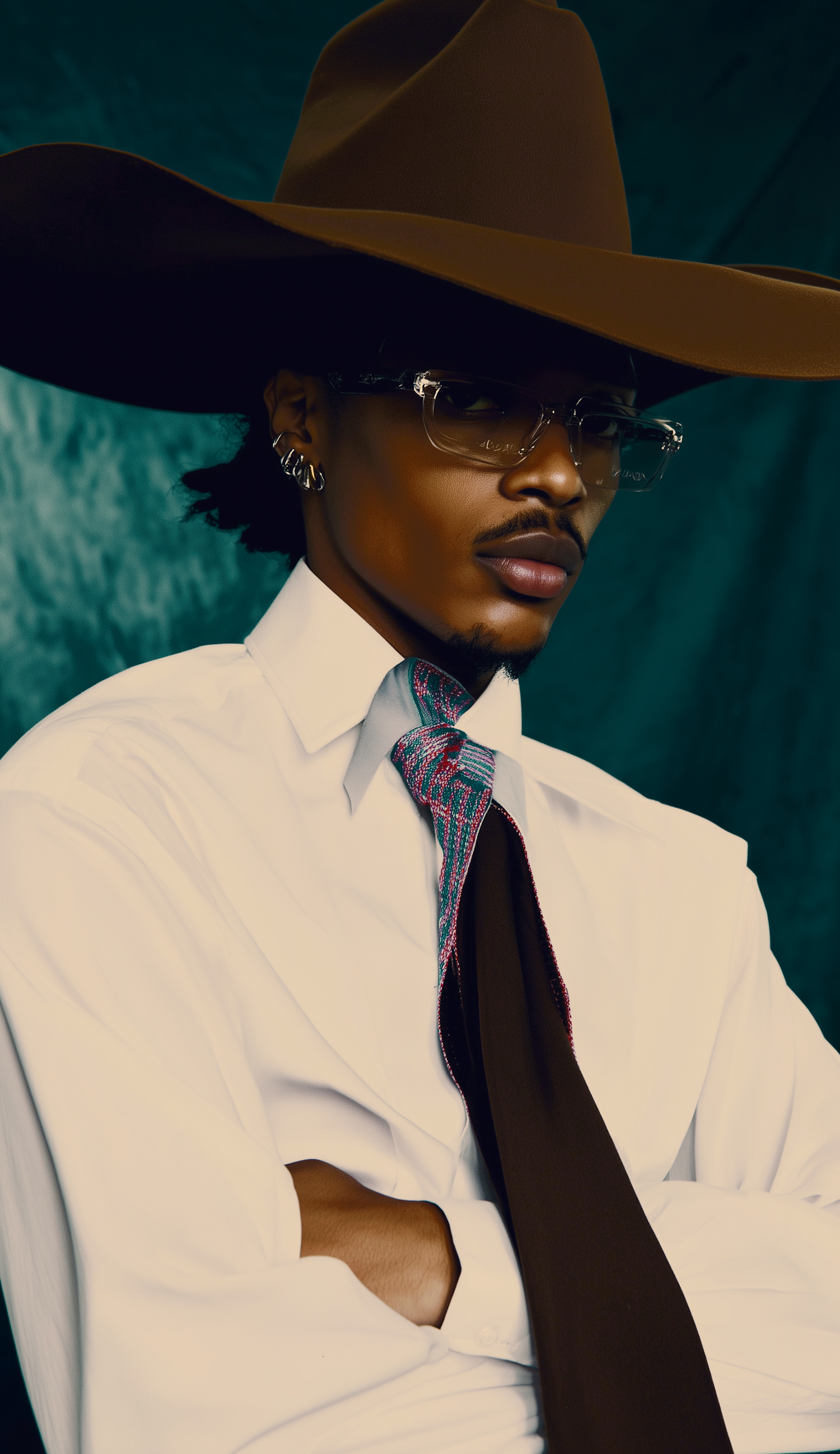 A fashionable portrait of a person in a wide-brimmed hat, clear glasses, and a white shirt with a colorful tie against a teal backdrop.