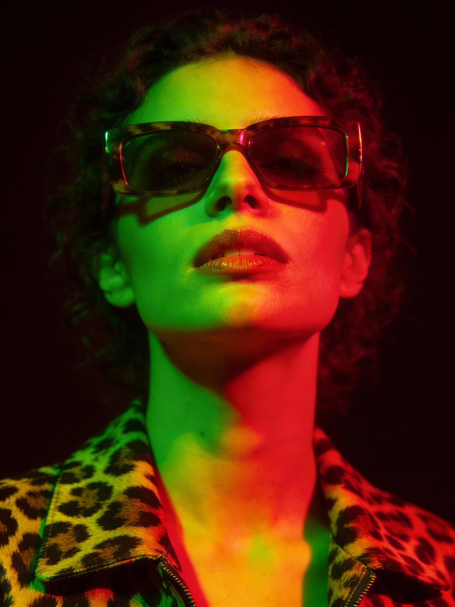 Stylish individual in sunglasses and leopard-print jacket under vibrant green and red lighting.
