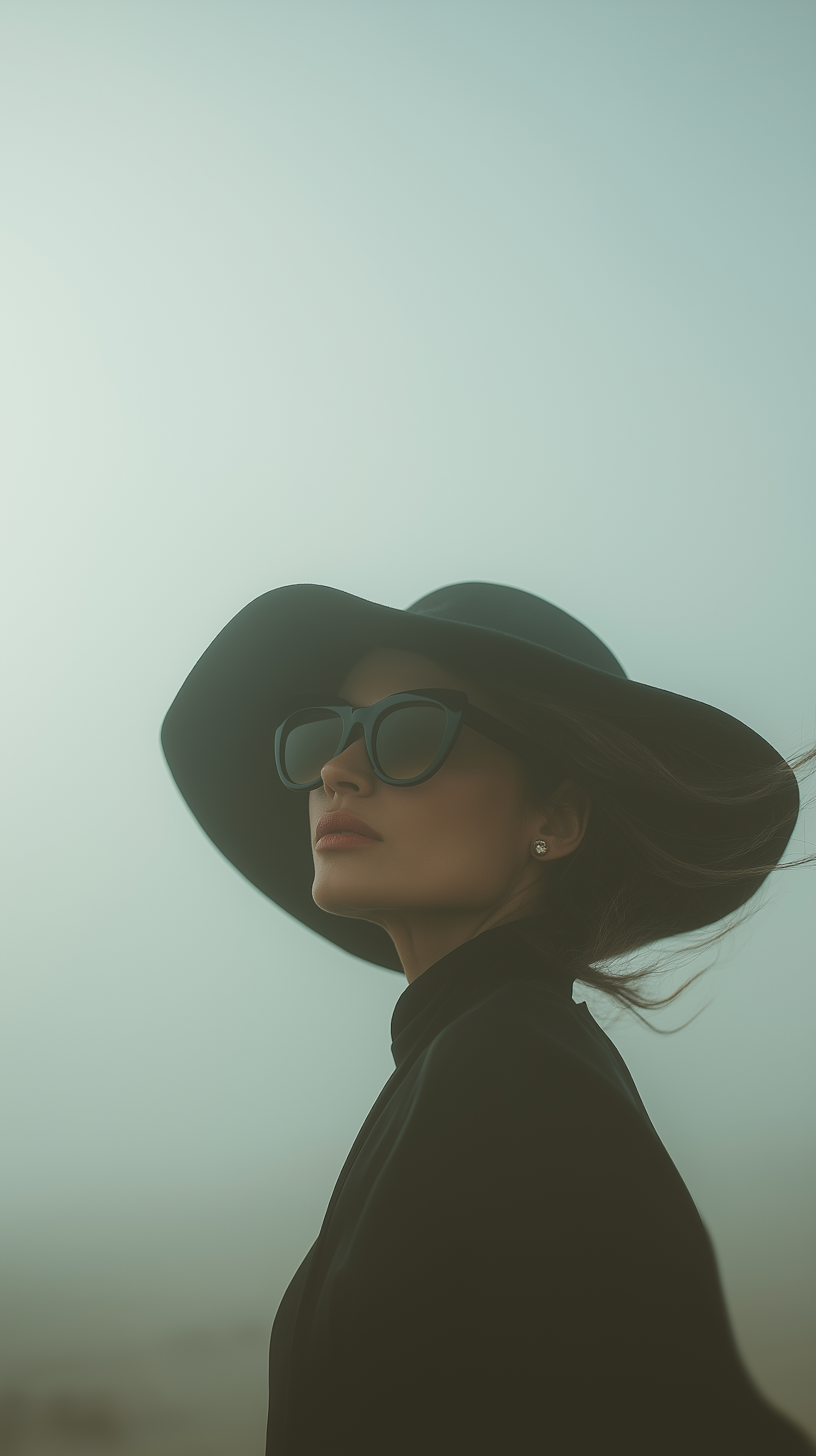 Person wearing dark sunglasses and a large hat, evoking timeless style against a soft, minimalist background.