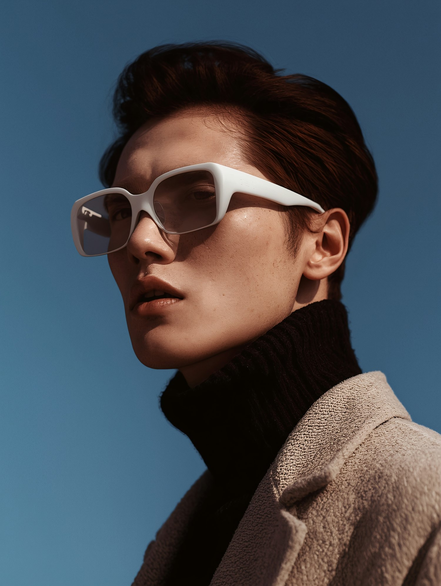 Stylish individual in white sunglasses, beige coat, and black turtleneck against a clear blue sky. A modern and bold fashion statement.