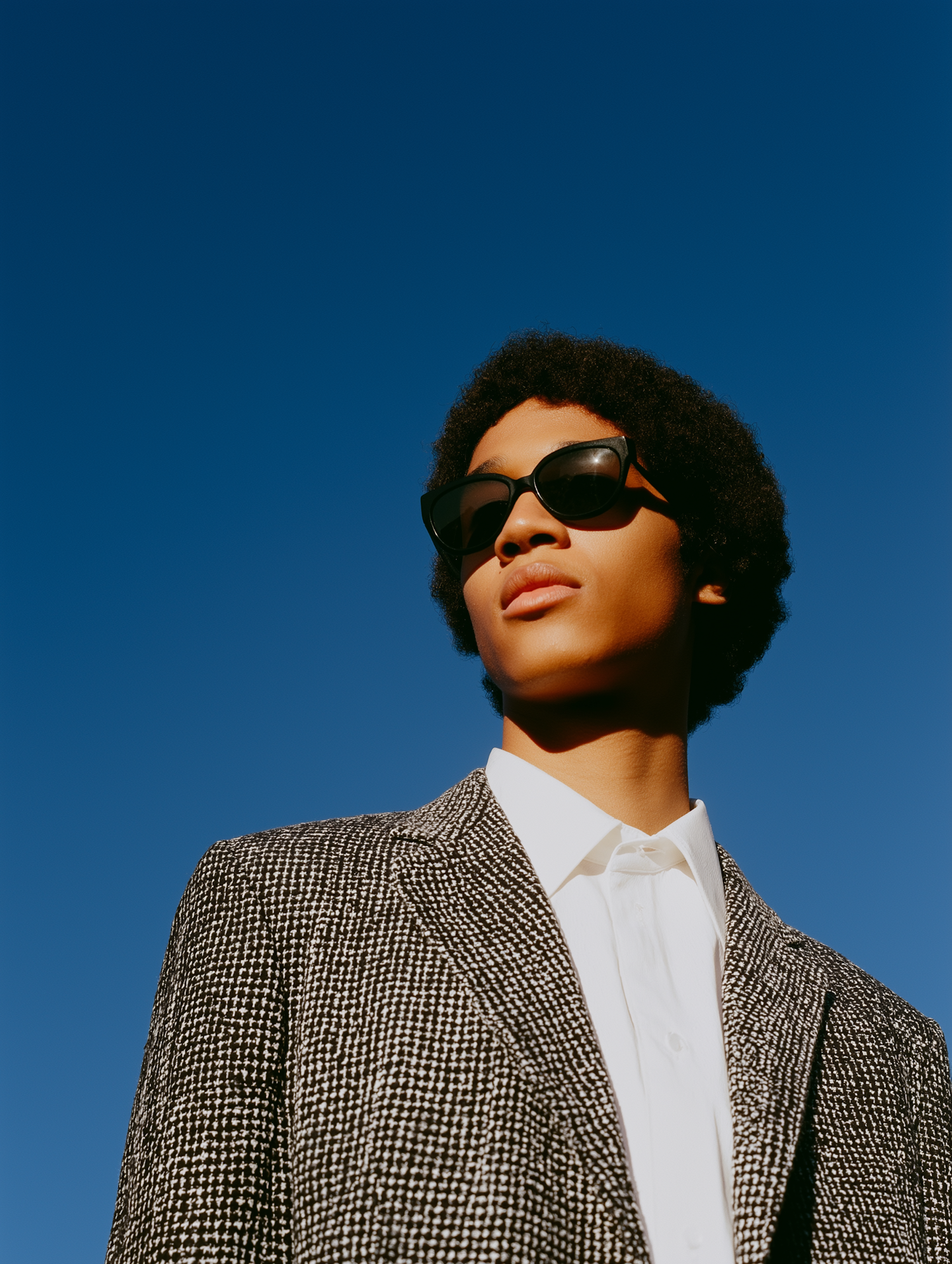Stylish individual in a textured blazer and sunglasses against a vibrant blue sky, showcasing modern fashion and elegance.