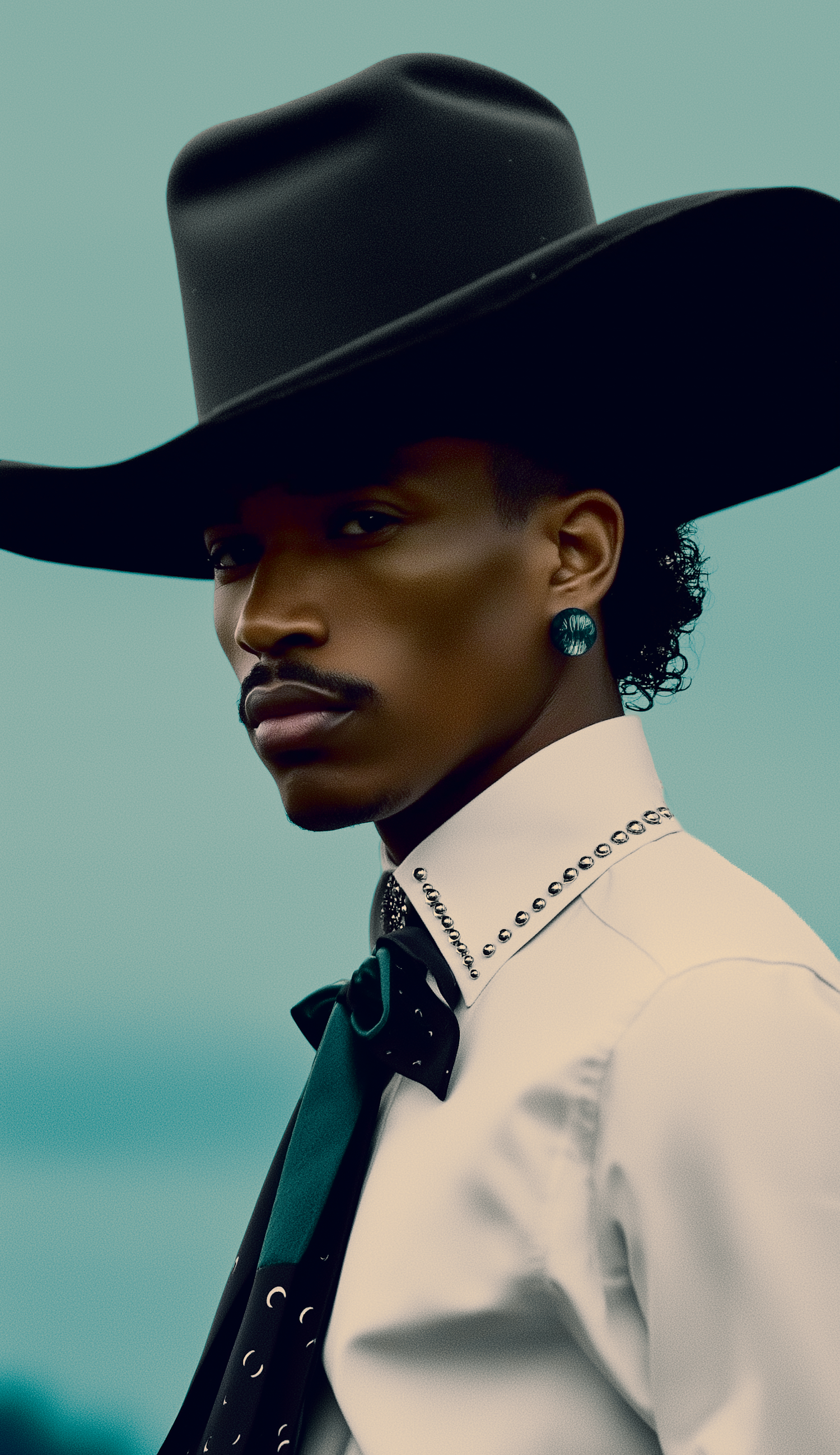 Stylish individual in a black hat and studded white shirt, accessorized with a green scarf and earring, set against a soft blue background.