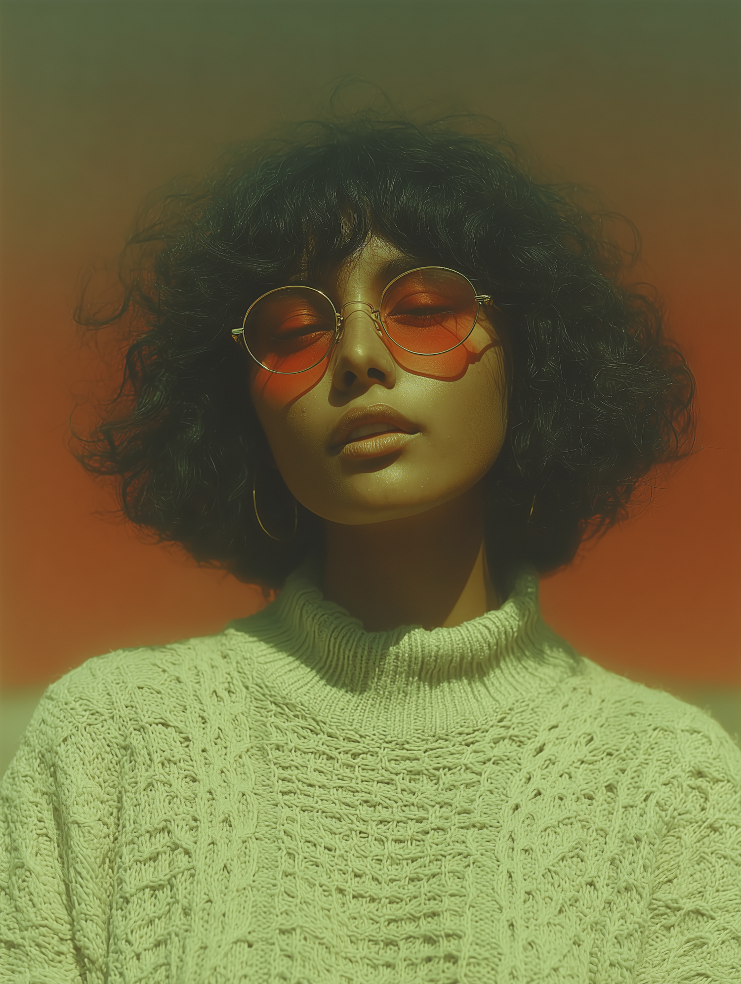 Stylish portrait of a person in orange-tinted glasses and a knit sweater, set against a warm gradient background.