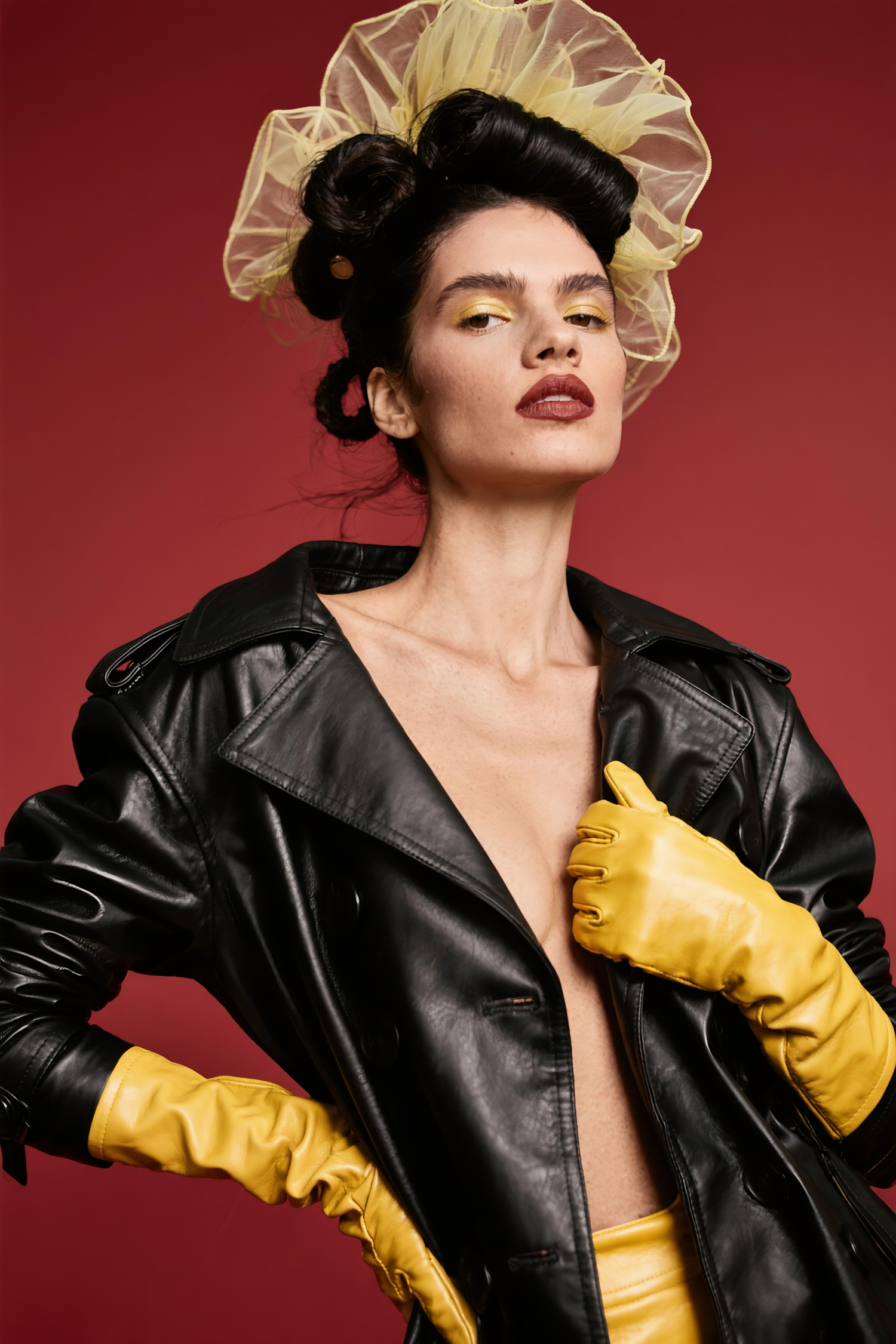 Stylish portrait of a person in a black leather jacket, yellow gloves, and bold makeup, set against a vibrant red background.