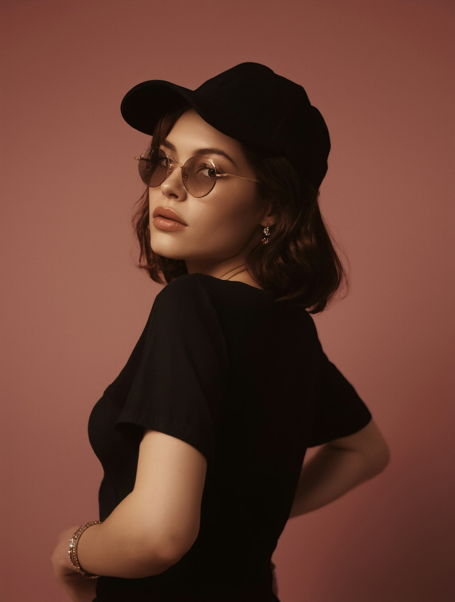 Stylish woman in a black cap and round glasses posing against a pink background, exuding a casual yet chic vibe.