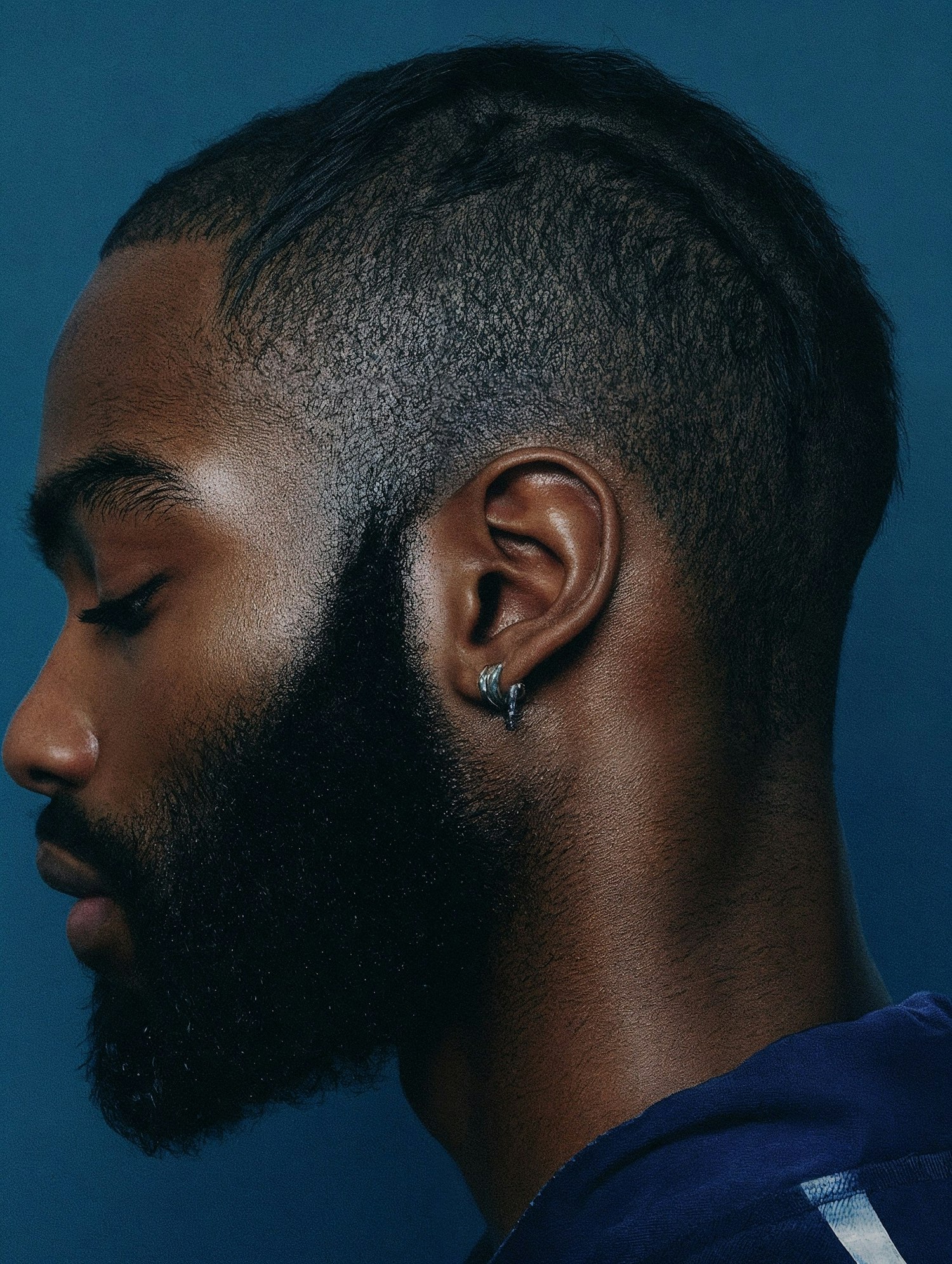 Close-up side profile of a man with a full beard, textured haircut, and silver earring against a muted blue background.