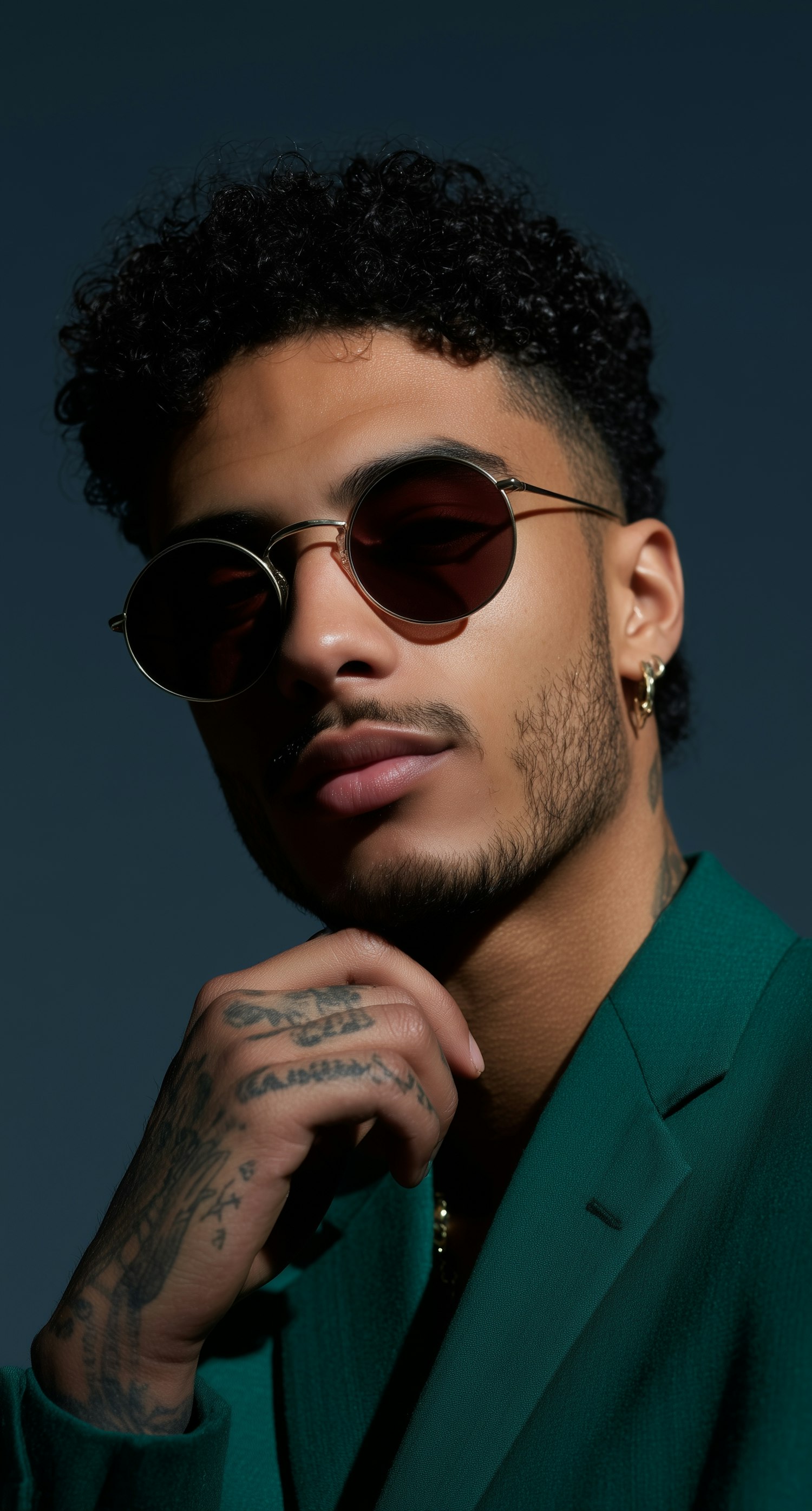 A stylish individual in a green blazer and round sunglasses poses thoughtfully, showcasing tattoos and gold earrings against a dark blue background.
