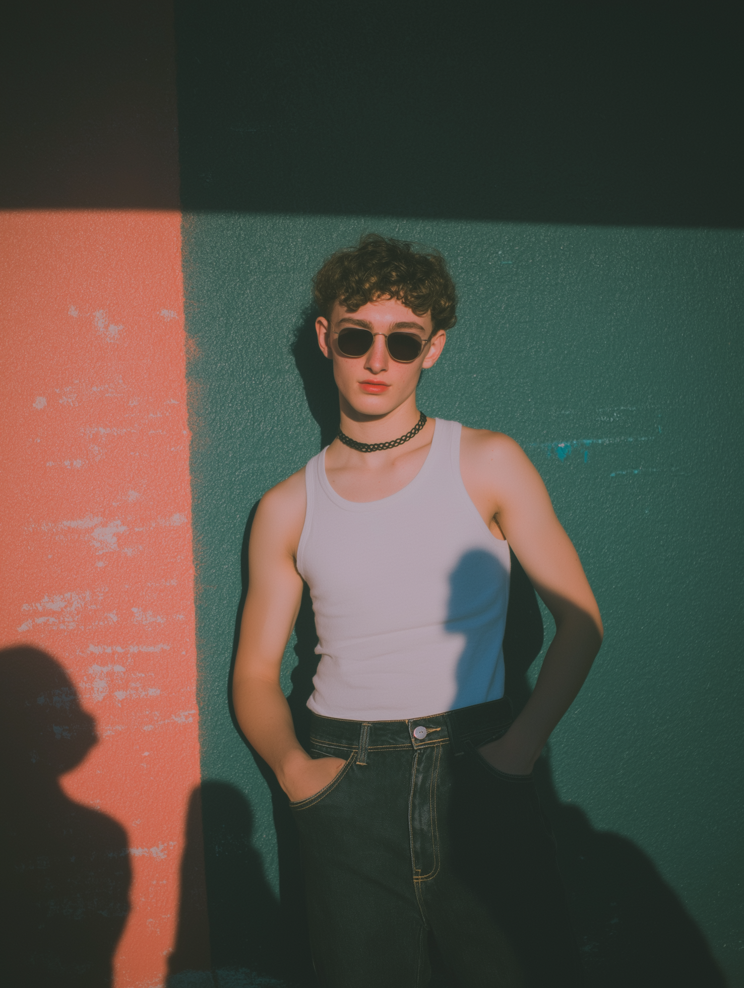 Stylish individual in a white tank top and sunglasses poses against a vibrant two-toned wall with dramatic lighting and shadows.