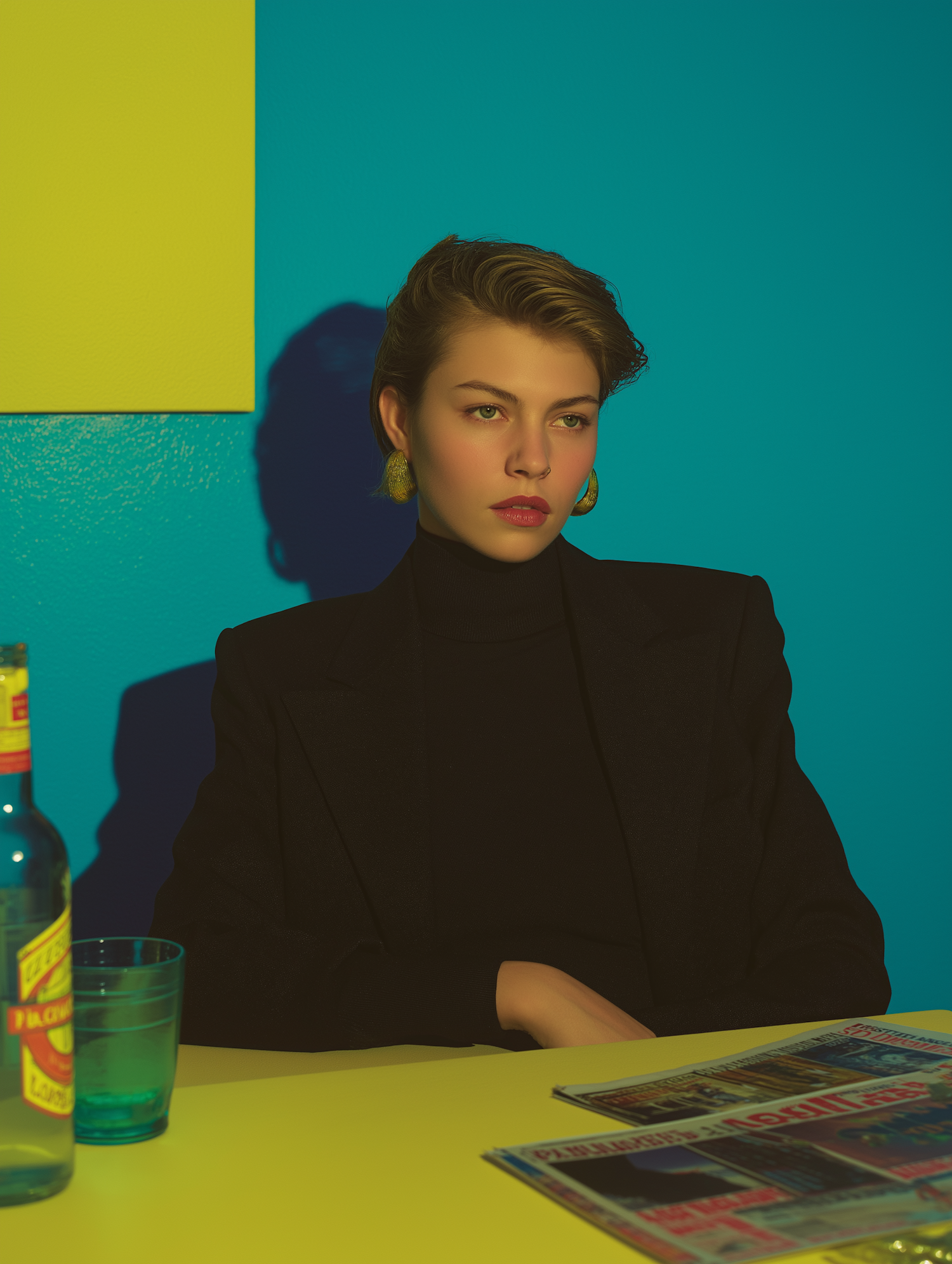 Stylish individual in black attire against a vibrant blue and yellow backdrop, with a bottle, glass, and magazines on the table.