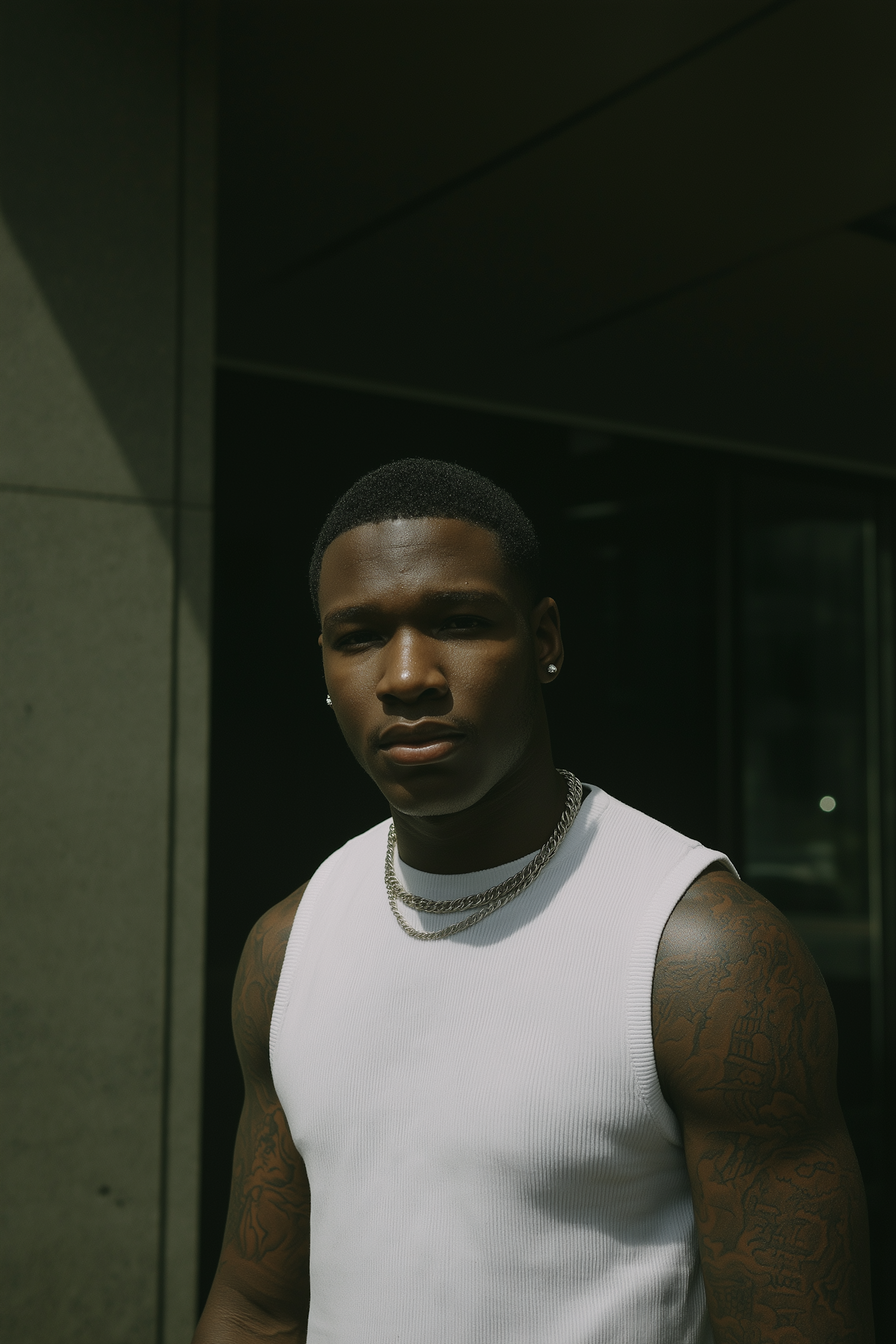 Stylish individual in a white sleeveless shirt, accessorized with a chain necklace, against a soft, dark-toned urban background.
