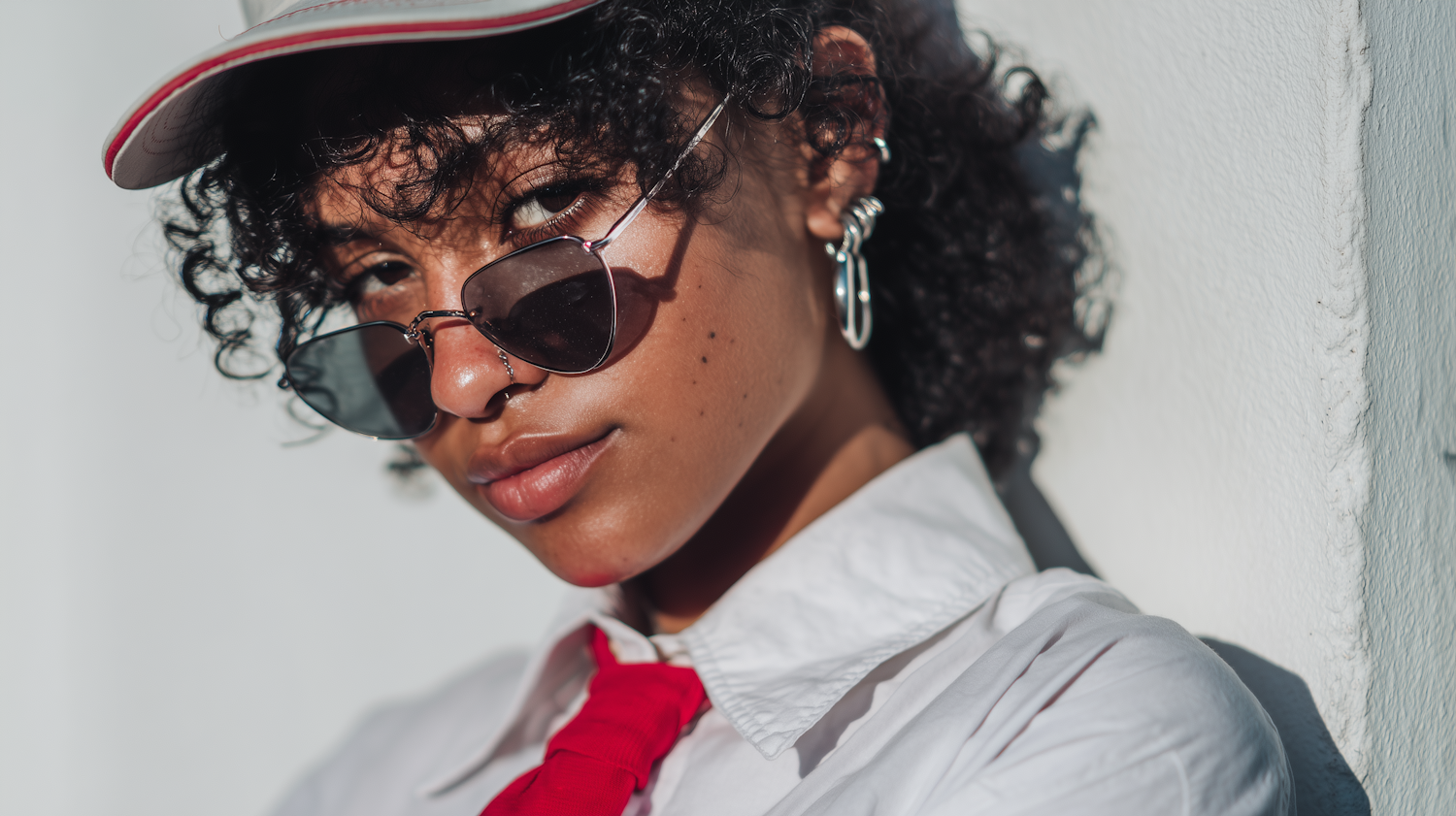 Stylish individual with curly hair, sunglasses, and a red tie against a white wall, exuding a cool and confident vibe.