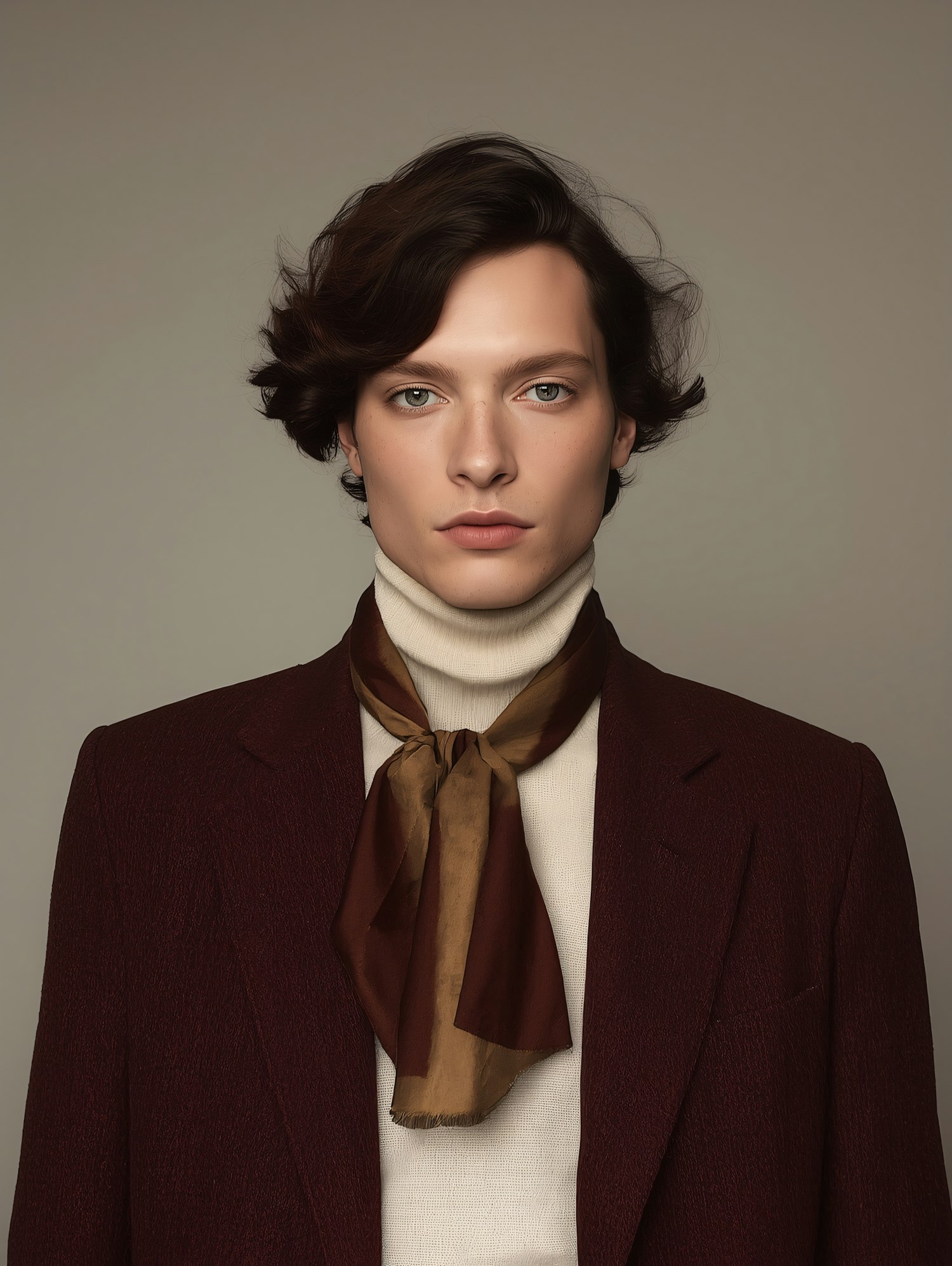 Stylish portrait of a person in a burgundy jacket, white turtleneck, and brown scarf, with wavy dark hair and a neutral background.