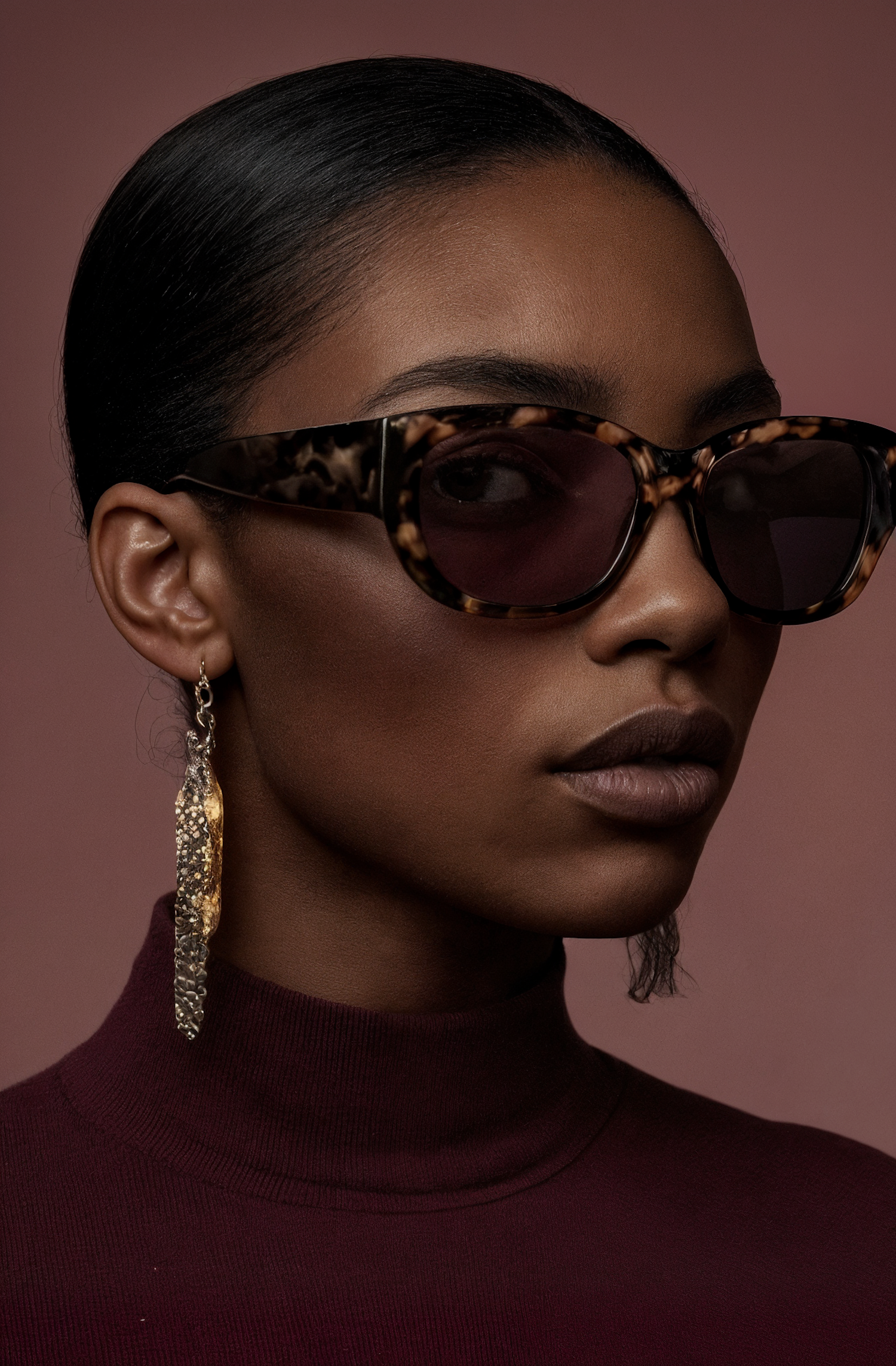 Close-up of a person wearing tortoiseshell sunglasses, a burgundy turtleneck, and a gold earring against a muted mauve background.