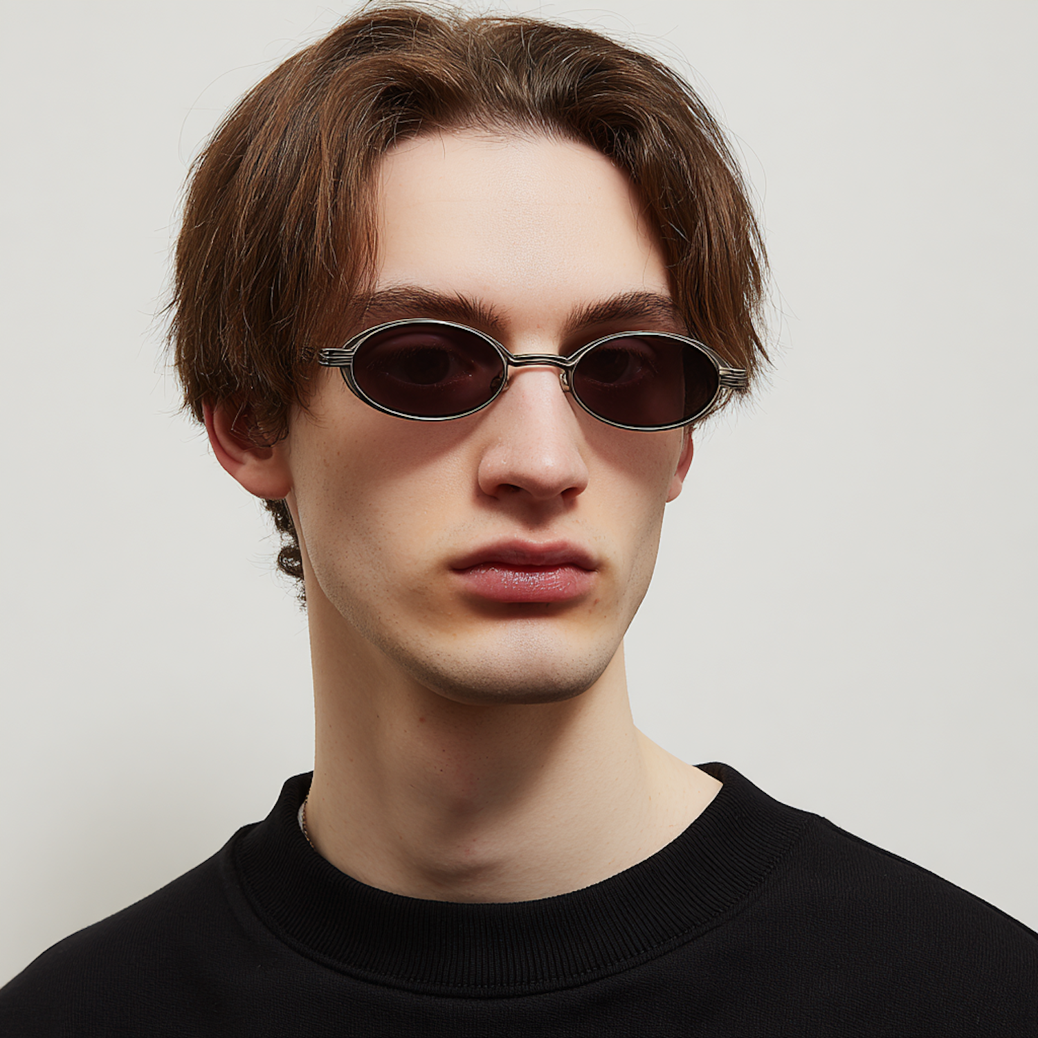 Stylish portrait of a person wearing oval sunglasses and a black top, set against a plain background for a modern and minimalistic vibe.