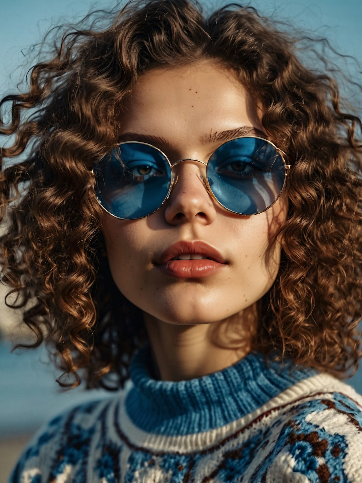 Stylish woman with curly hair and blue sunglasses in a patterned sweater, exuding confidence and modern flair.