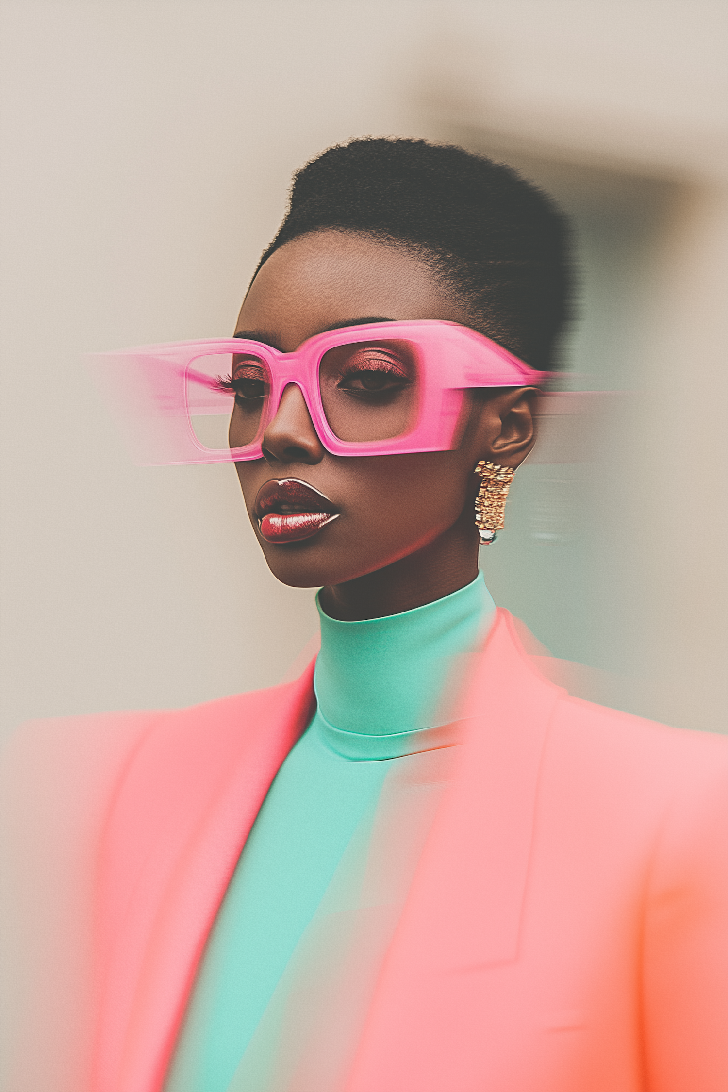 Stylish portrait of a woman in bold pink glasses, neon green turtleneck, coral blazer, and gold earrings with a motion blur effect.