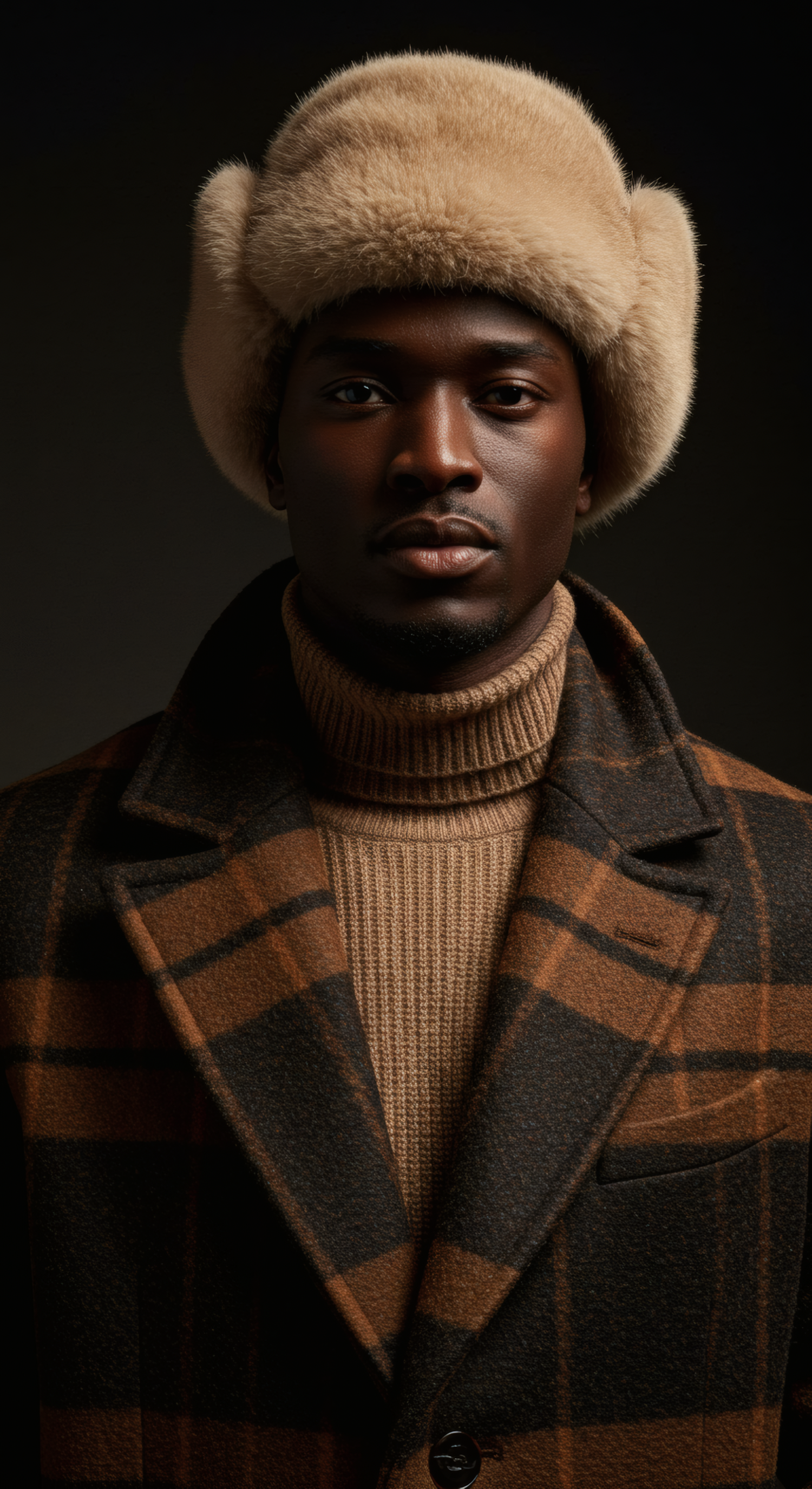 Stylish man in a fur hat and plaid coat, exuding elegance with warm tones and soft lighting.