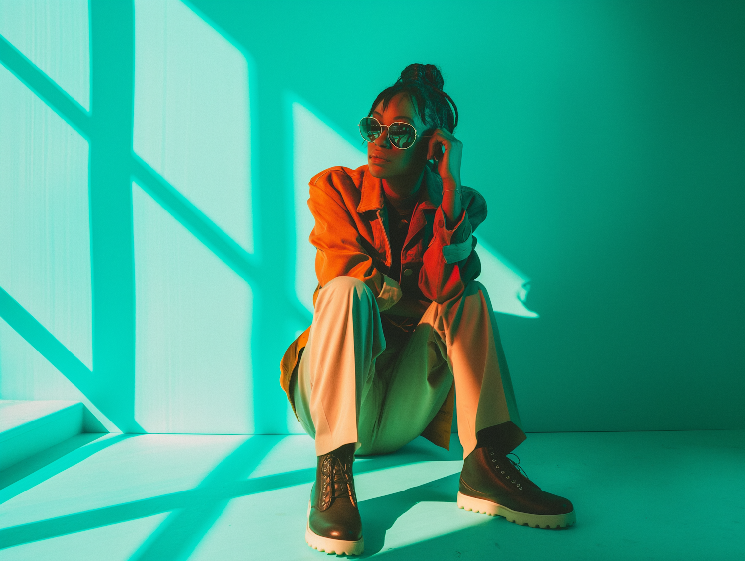Stylish woman in teal-lit room, wearing sunglasses, brown jacket, beige pants, and chunky boots. Modern, artistic vibe with geometric shadows.