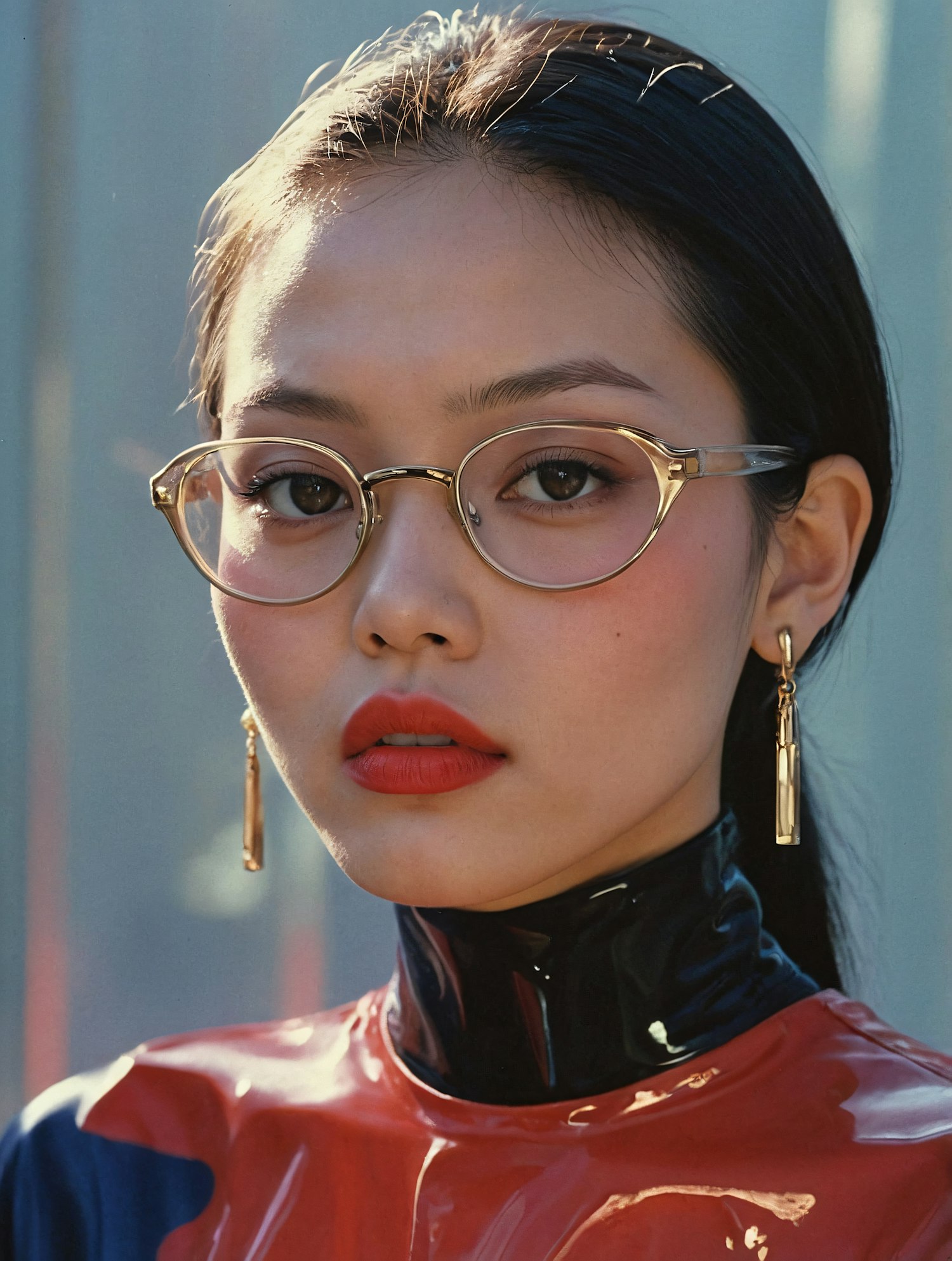 Stylish Asian woman with glasses and bold red lips, wearing elegant earrings and a glossy red and black outfit.