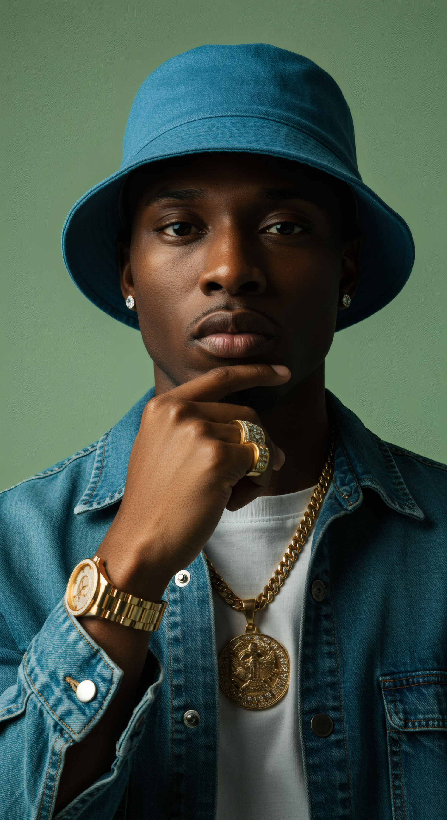 Stylish young man in denim and gold accessories, wearing a blue bucket hat and diamond earrings against a green background.