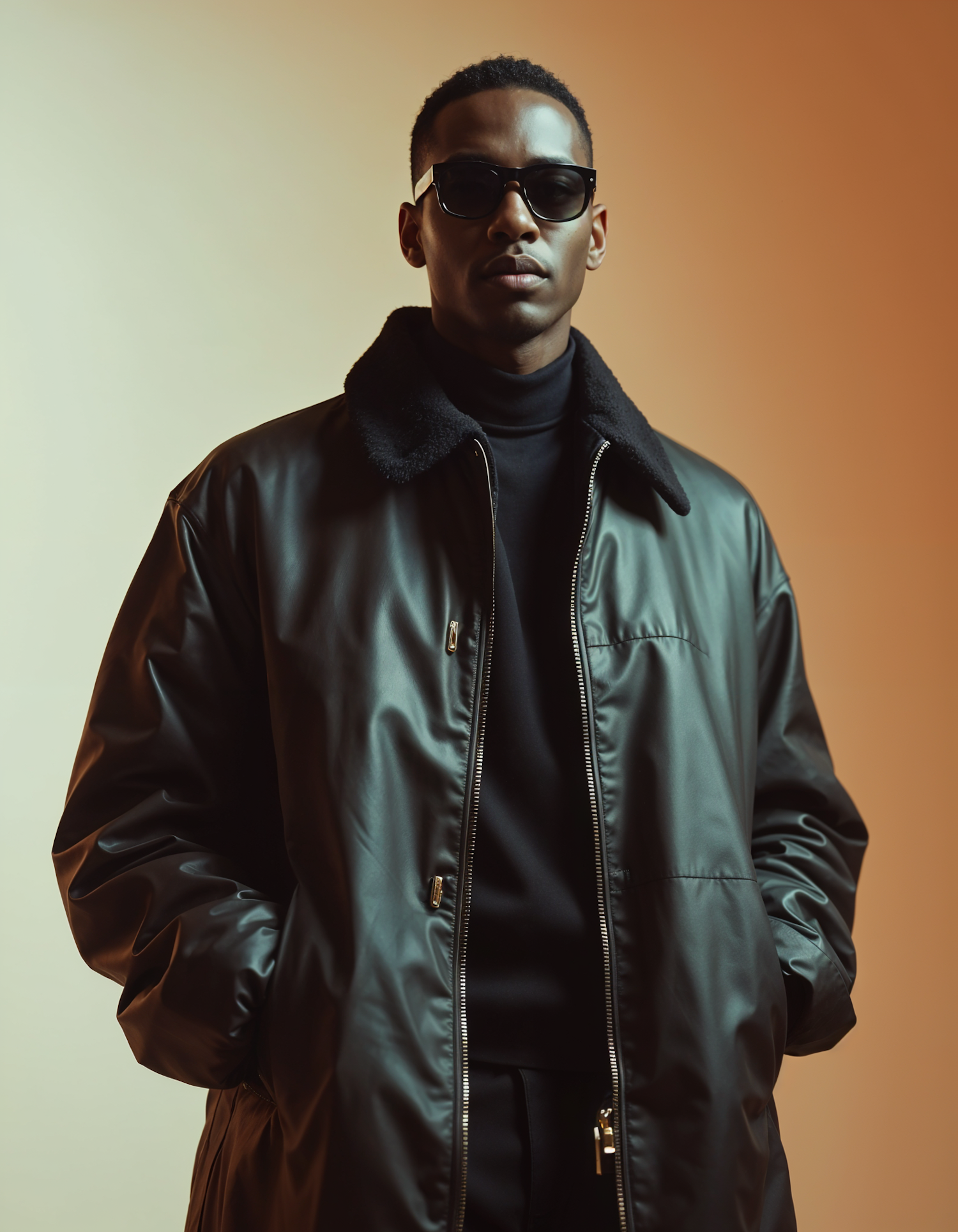 Stylish Black man in sunglasses and leather jacket against a warm gradient background, exuding confidence and sophistication.