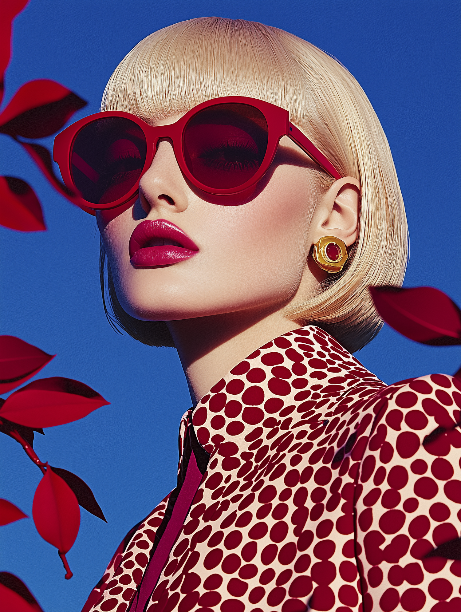 Stylish woman with red sunglasses and polka dot blouse against a blue sky, framed by red leaves. Fashionable and bold aesthetic.