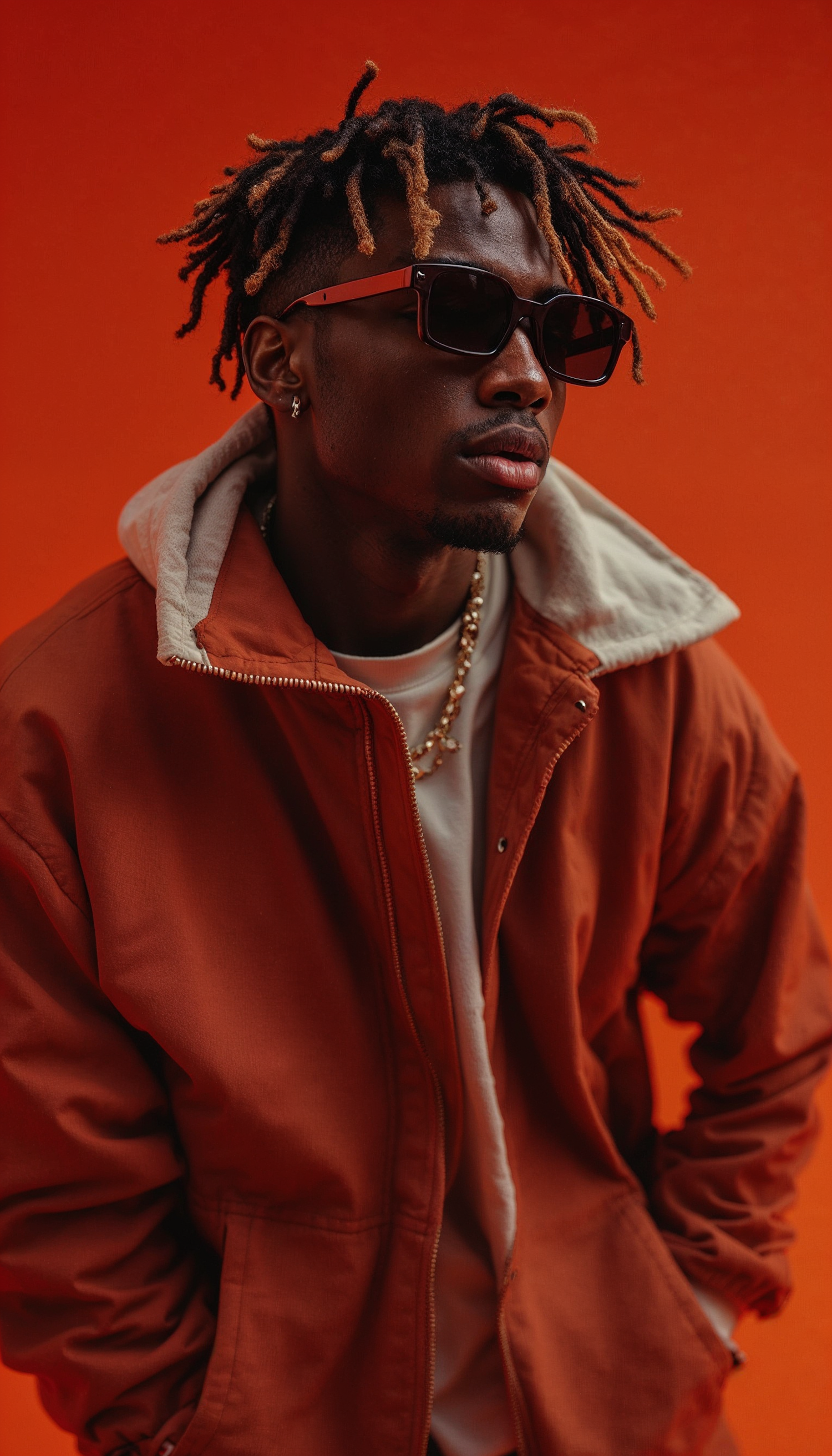 Stylish man with dreadlocks and sunglasses in a rust jacket against an orange background, exuding confidence and fashion.