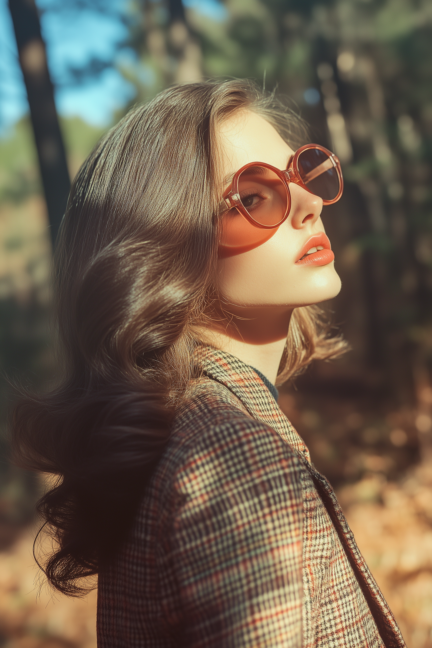 Stylish woman in plaid jacket and orange sunglasses in a sunlit forest, exuding retro elegance and confidence.