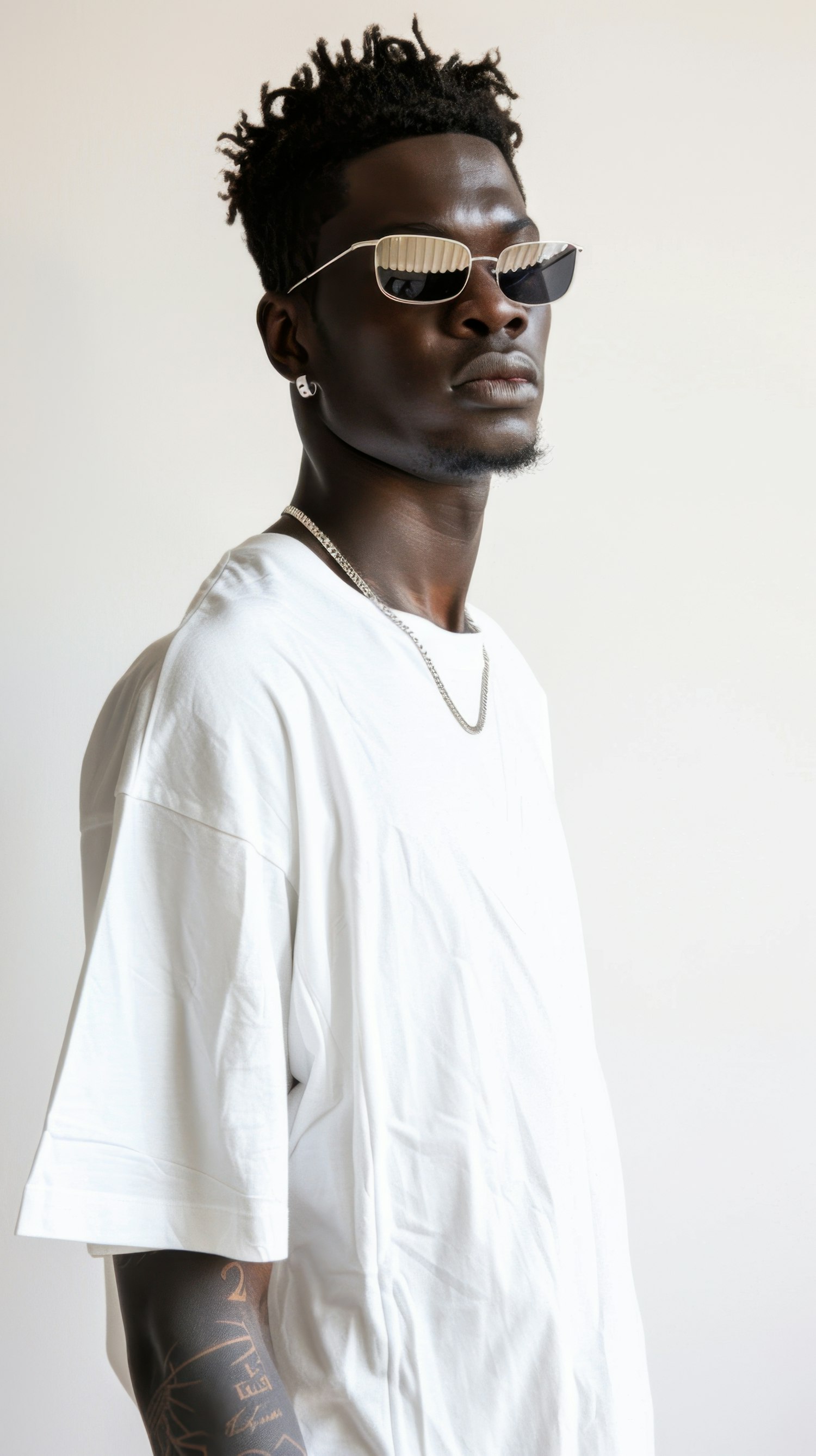 Stylish man with sunglasses and tattoos in a white t-shirt, exuding confidence and modern fashion sense.