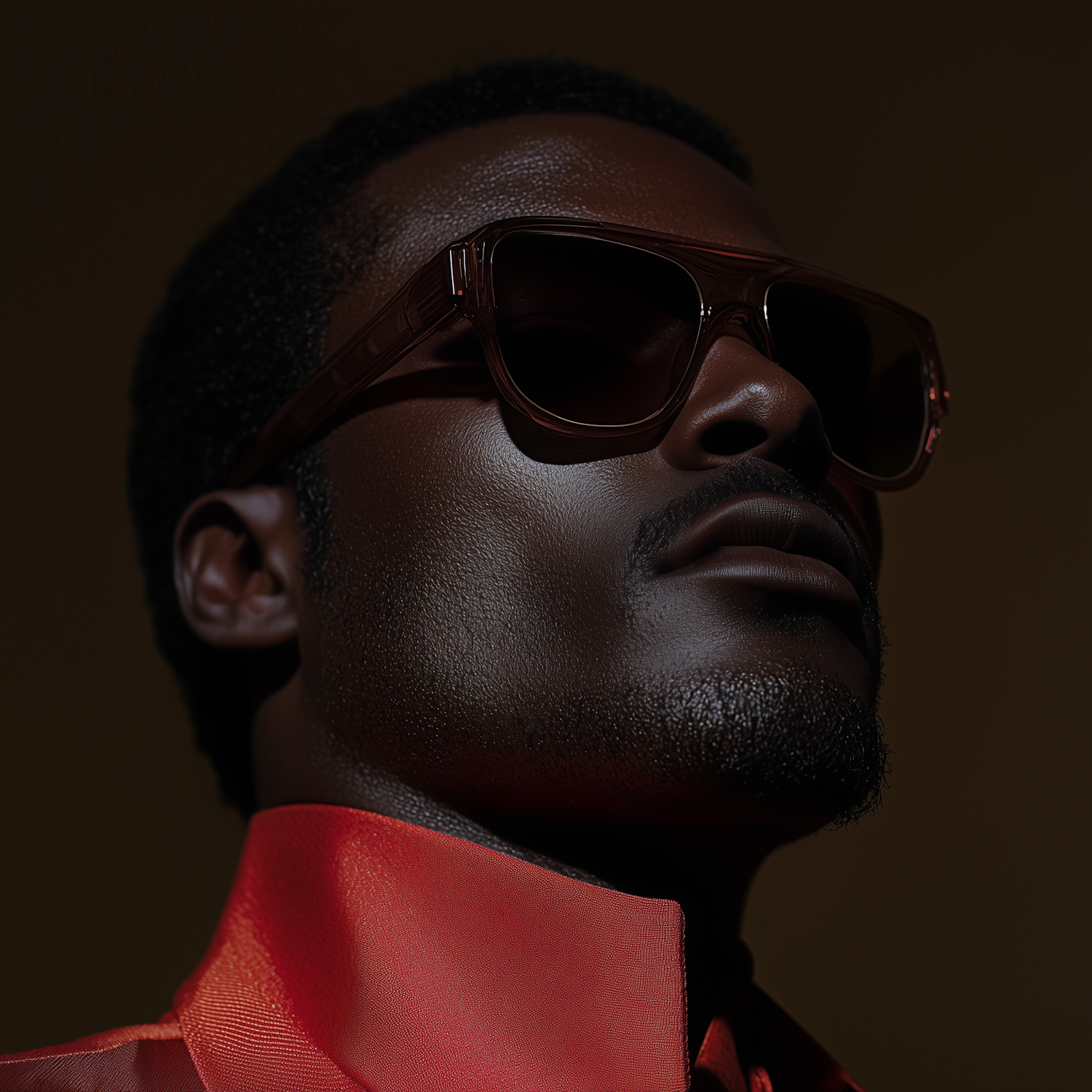 Stylish portrait of a man in sunglasses and a red shirt, exuding confidence with dramatic lighting and a dark background.