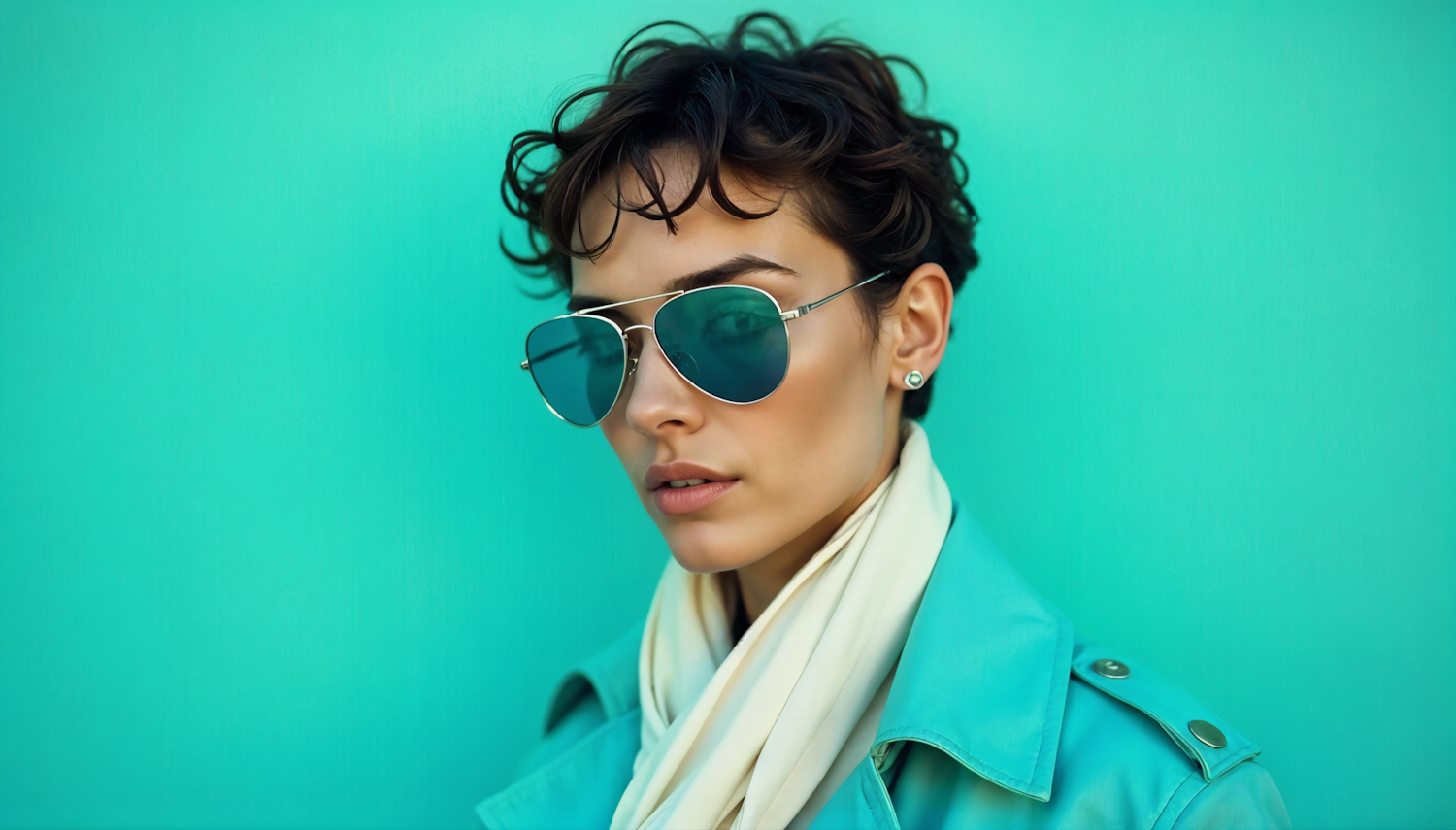 Stylish person in aviator sunglasses and turquoise jacket against a matching background, exuding modern elegance.