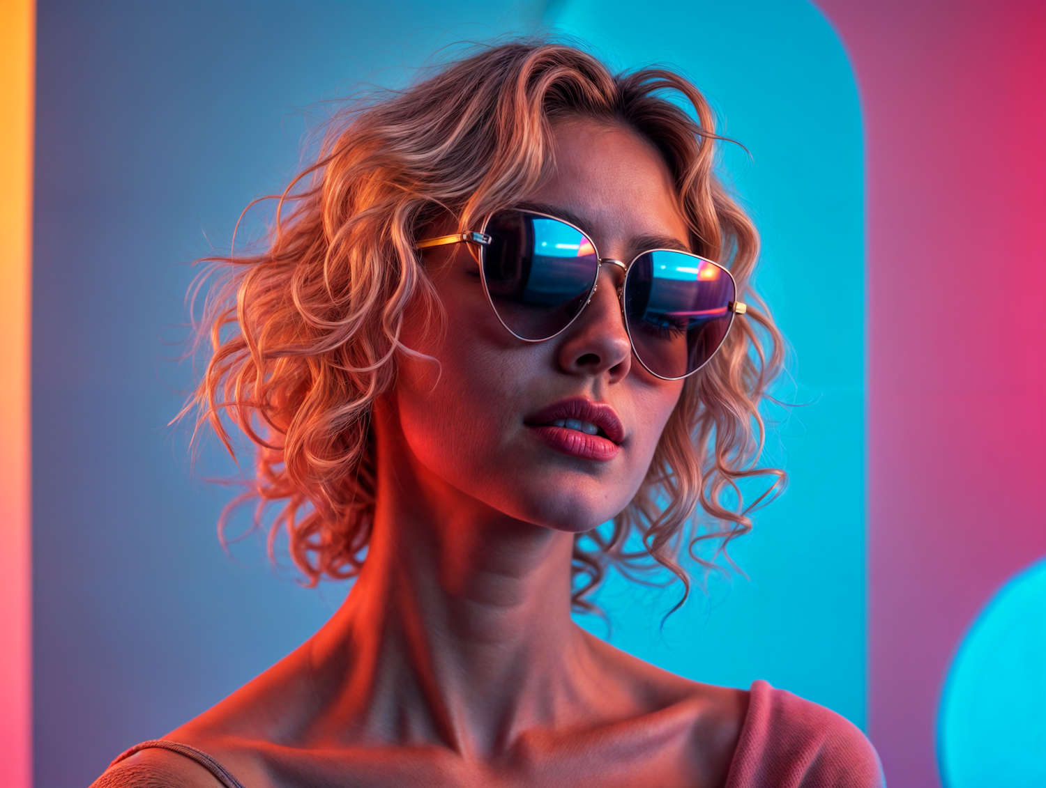 Stylish woman with curly blonde hair and sunglasses against a vibrant blue and pink background, exuding confidence and modern flair.