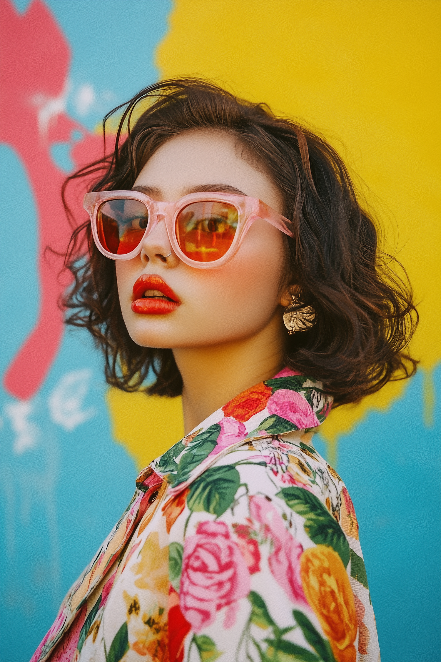 Stylish woman in floral shirt and pink sunglasses against a vibrant, colorful background. Bold fashion and artistic expression.