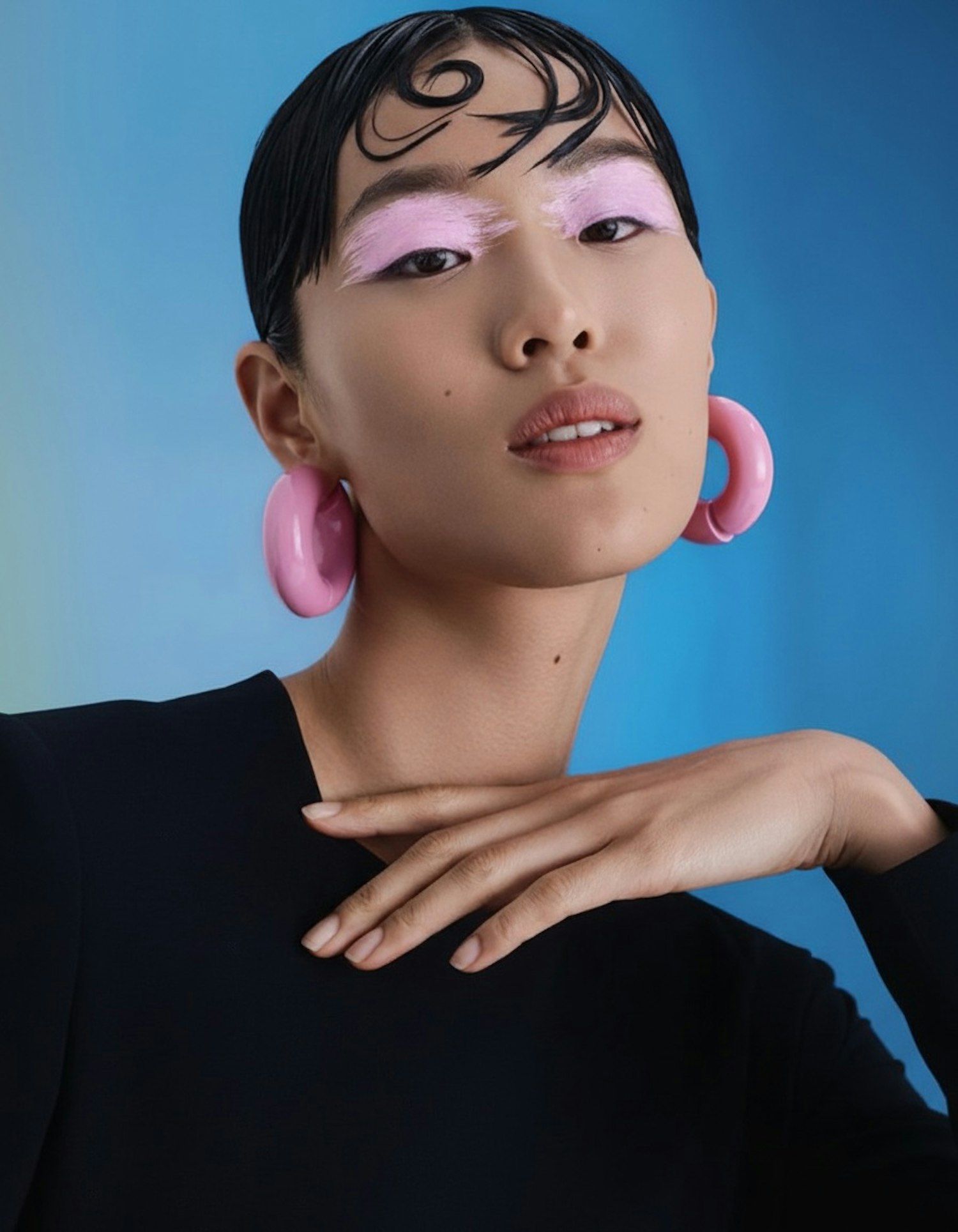 Stylish portrait of a person with bold pink makeup and earrings, set against a vibrant blue background.
