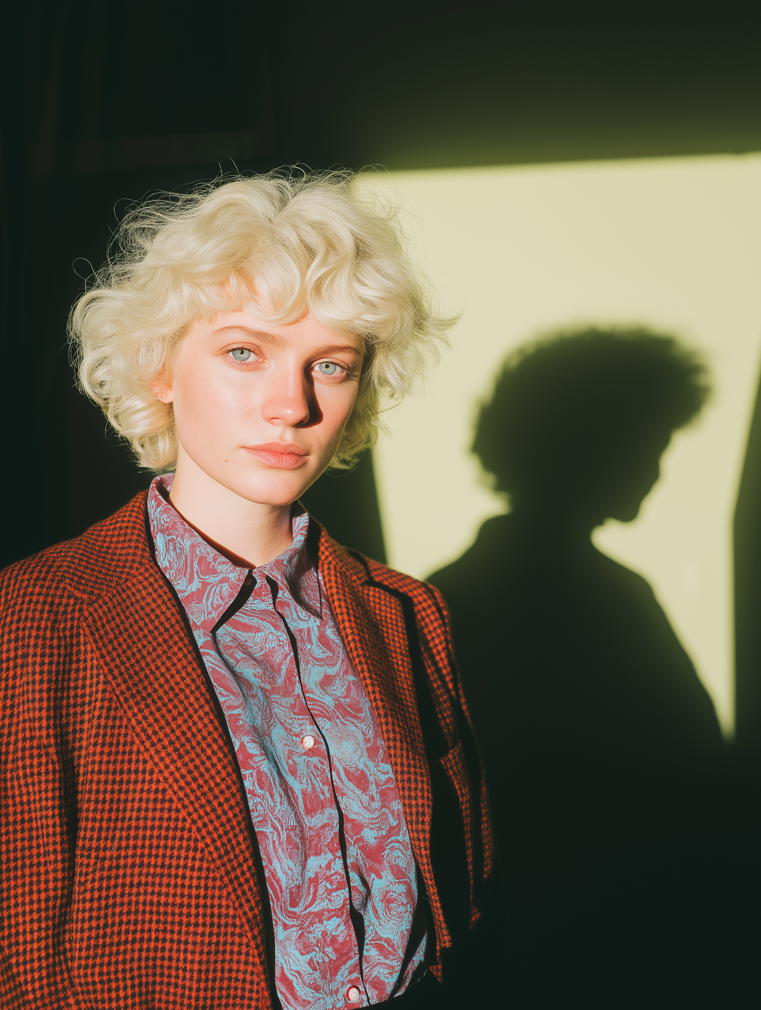 A person with platinum blonde hair in a red checkered blazer and patterned shirt stands against a shadowed background.