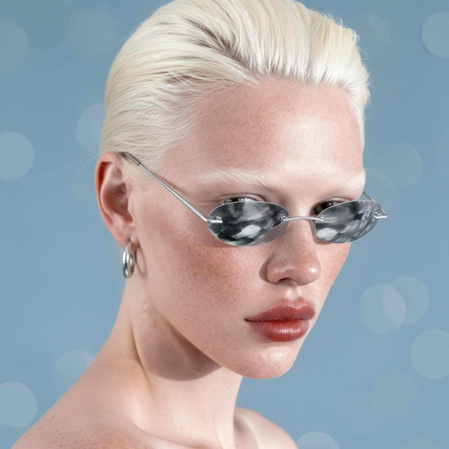 Stylish portrait of a person with platinum blonde hair, reflective sunglasses, and a soft blue bokeh background.