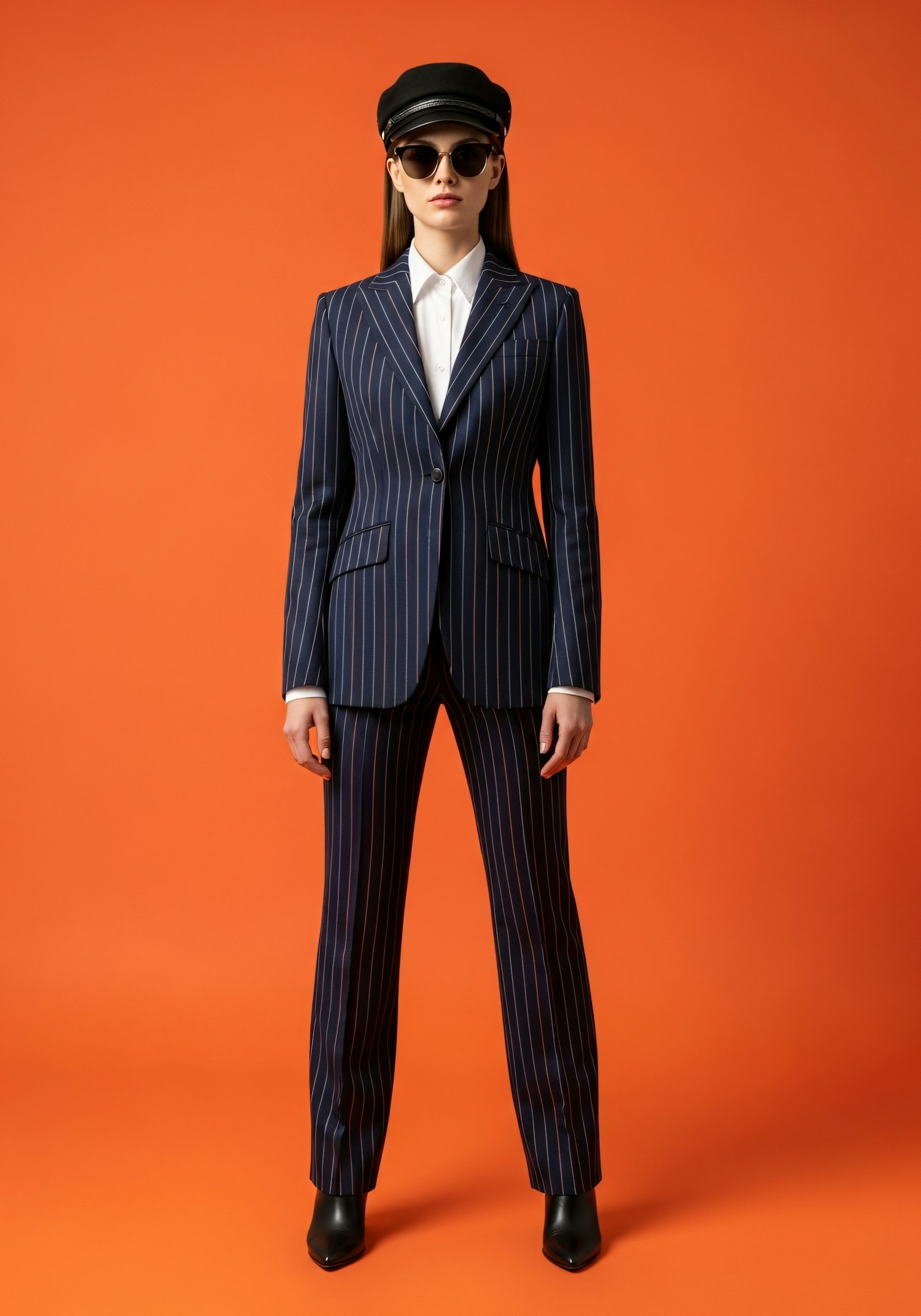 Stylish individual in a navy pinstripe suit with a white shirt, black cap, and sunglasses, set against a bold orange background.
