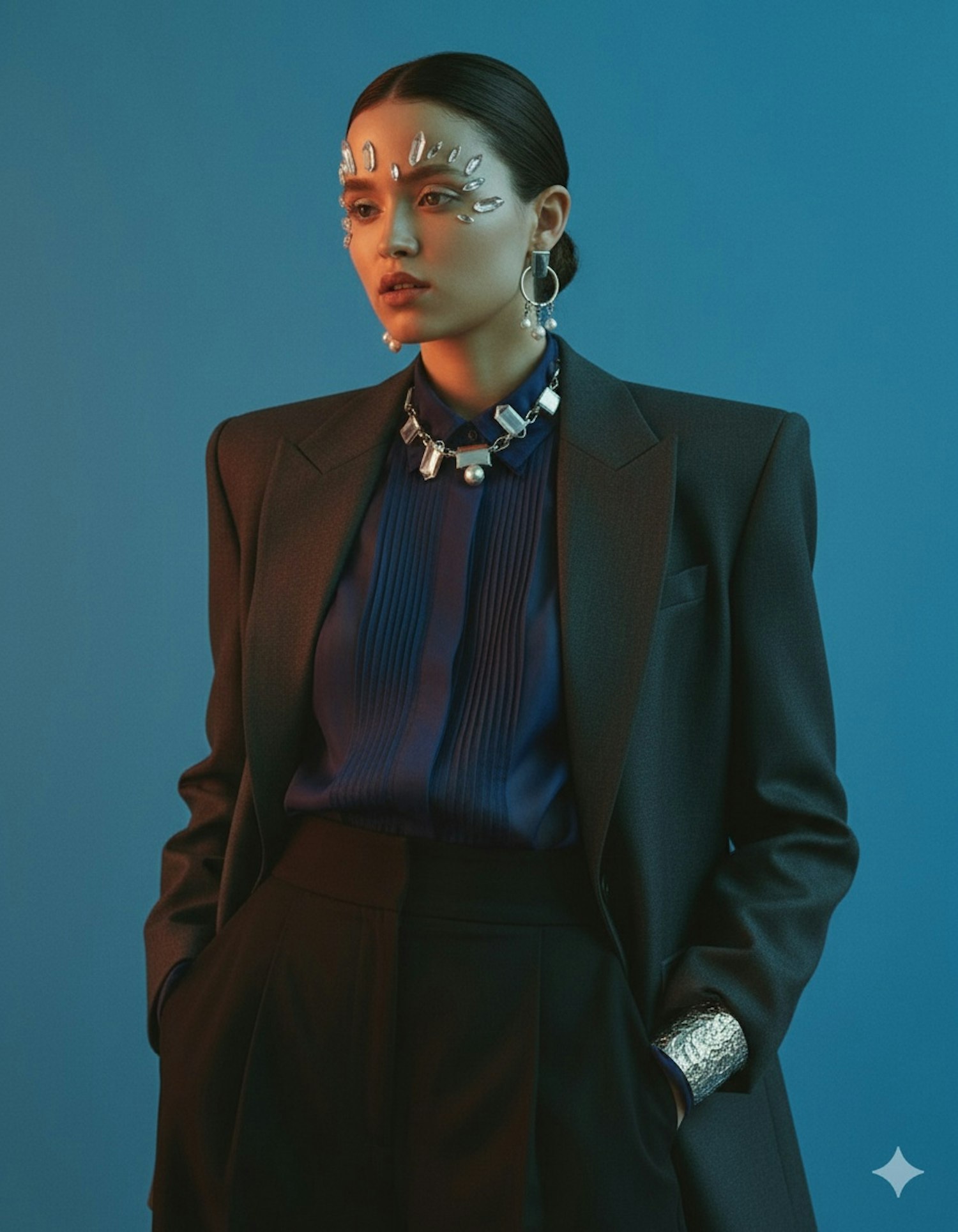 Stylish portrait of a person in a dark blazer and blue shirt, adorned with crystal-like face embellishments and bold jewelry.